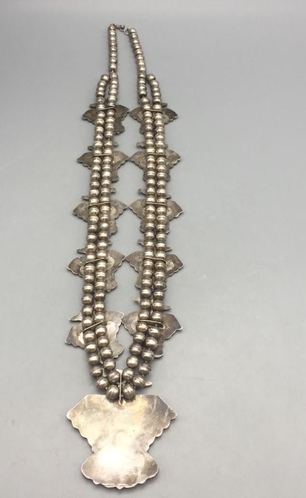 Description: This is a beautiful necklace, that features a Zuni inlay thunderbird design. It is a well made necklace set with turquoise, coral, onyx, and mother of pearl. It has a nice balanced feel to it and is sterling silver. Maker: Unmarked. Approx. Age: Circa 1970s. Size: It fits approx. 29 inches around the neck. Weighs 227.7 g. Condition: Good for its age. Normal wear and minor imperfections expected on used and vintage items. Please look closely at the pictures as they are an important part of our description. Shipping: There will be a $5 handling / packaging fee for shipping this lot. The actual cost of postage will be added on top of that. BUY IT NOW: If you would like to buy this item now without waiting for the auction to end (this option is only available up to 48 hours before the auction starts to close), the “Buy it Now” price is the high estimate of this lot. If you would like to end the auction early and pay the high estimate (plus applicable fees), please contact us by phone or email and reference this lot number.