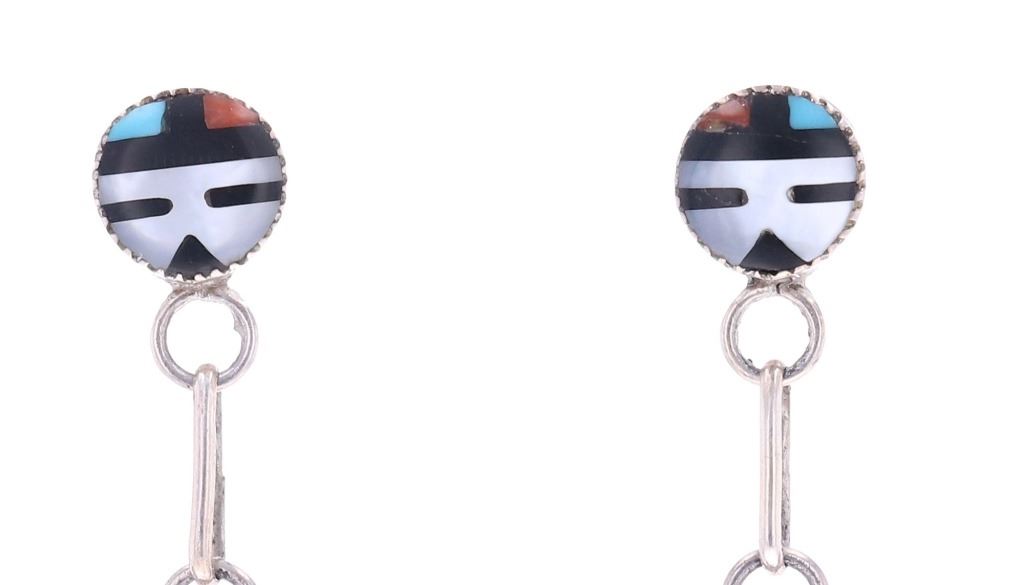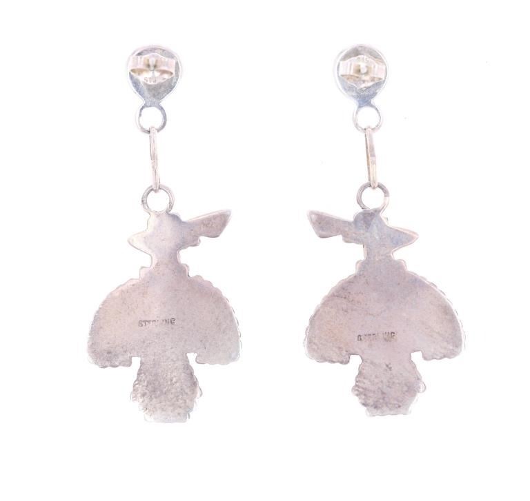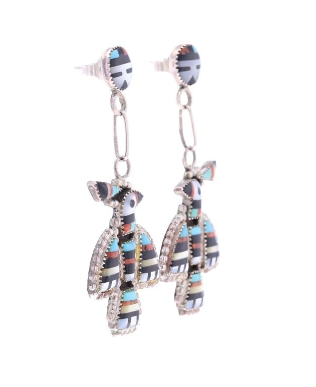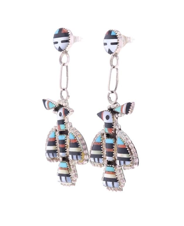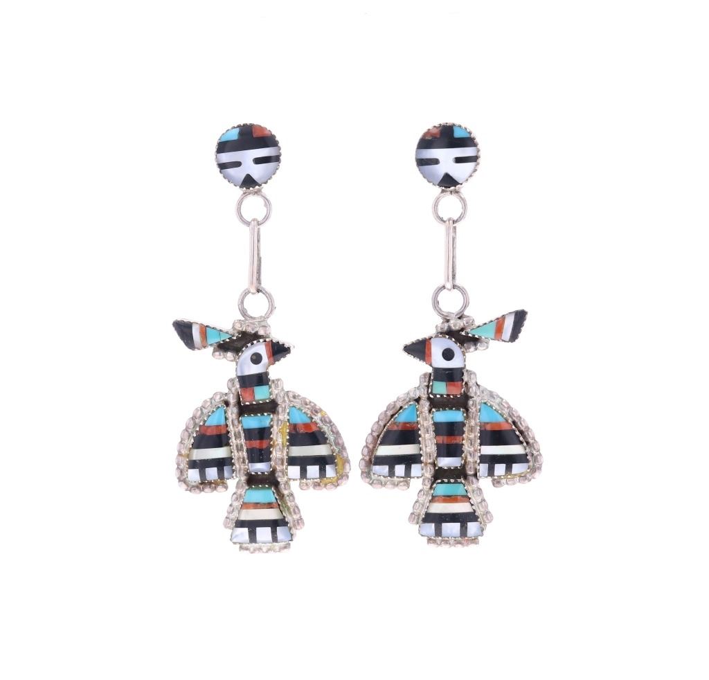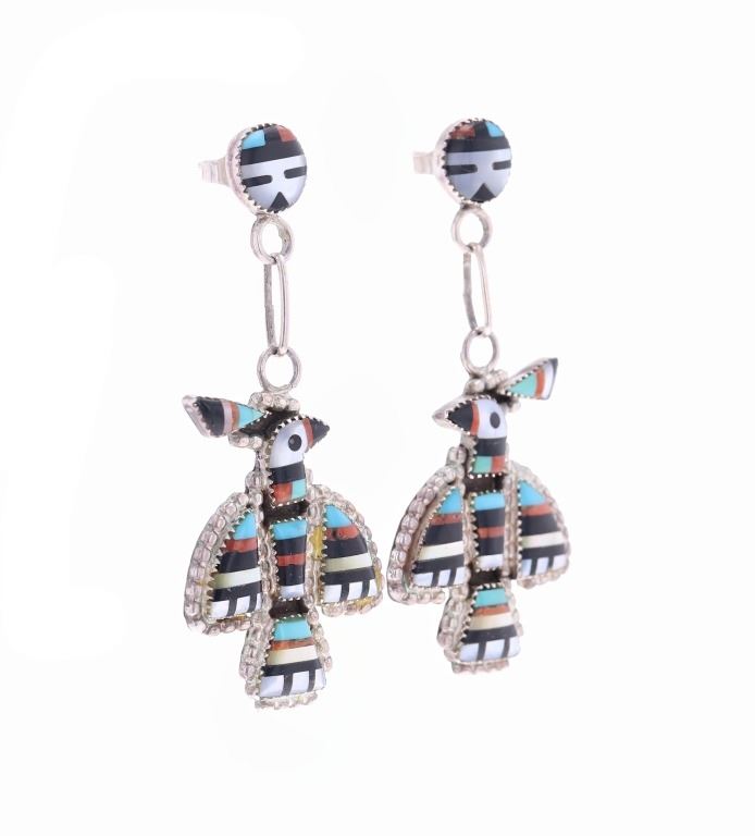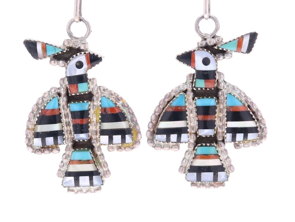 Featured in this lot is this vintage Zuni multistone inlaid Thunderbird circa 1970's. The earrings feature a wonderfully and professionally crafted sterling silver and multistone construction that includes stones such as: mother of pearl, onyx, turquoise, and red branch coral. The earrings are in the design of the Thunderbird and shows sun faces on the stud portion of the dangle earrings. The Thunderbird holds significant meaning for the Zuni people. For the Zuni, the Thunderbird is connected to the life-giving forces of nature, particularly rain, which is essential for their agriculture in the arid regions of the American Southwest. The earrings are marked on the back of the earrings as follows: Sterling. The condition of this pair of Zuni earrings is good with no obvious signs of damage and shows good overall condition. The measurements of this pair of earrings is 2 1/8" x 1" x 1/2". The collective weight of this pair of earrings is 10.2g.