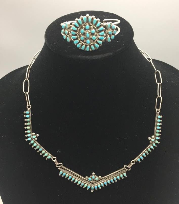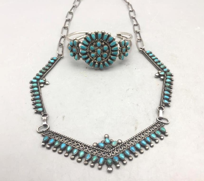 Offered for sale in this lot is a vintage Zuni necklace and bracelet. This is a beautiful petit point necklace and bracelet (bracelet is in a cluster design). Maker: Necklace is unmarked and bracelet is marked L.P. Zuni. Approx. Age: Vintage. Size: Necklace fits 17" neck. Bracelet measures 5". Opening is an additional 1", flitting a 6" wrist. Width is 1-1/4". Weighs 43.3 grams, Condition: Good for its age, normal wear expected. Please look closely at the pictures - they are an important part of our description. Shipping: There will be a $5 handling, packaging fee for shipping this lot. The actual cost of postage will be added on top of that.