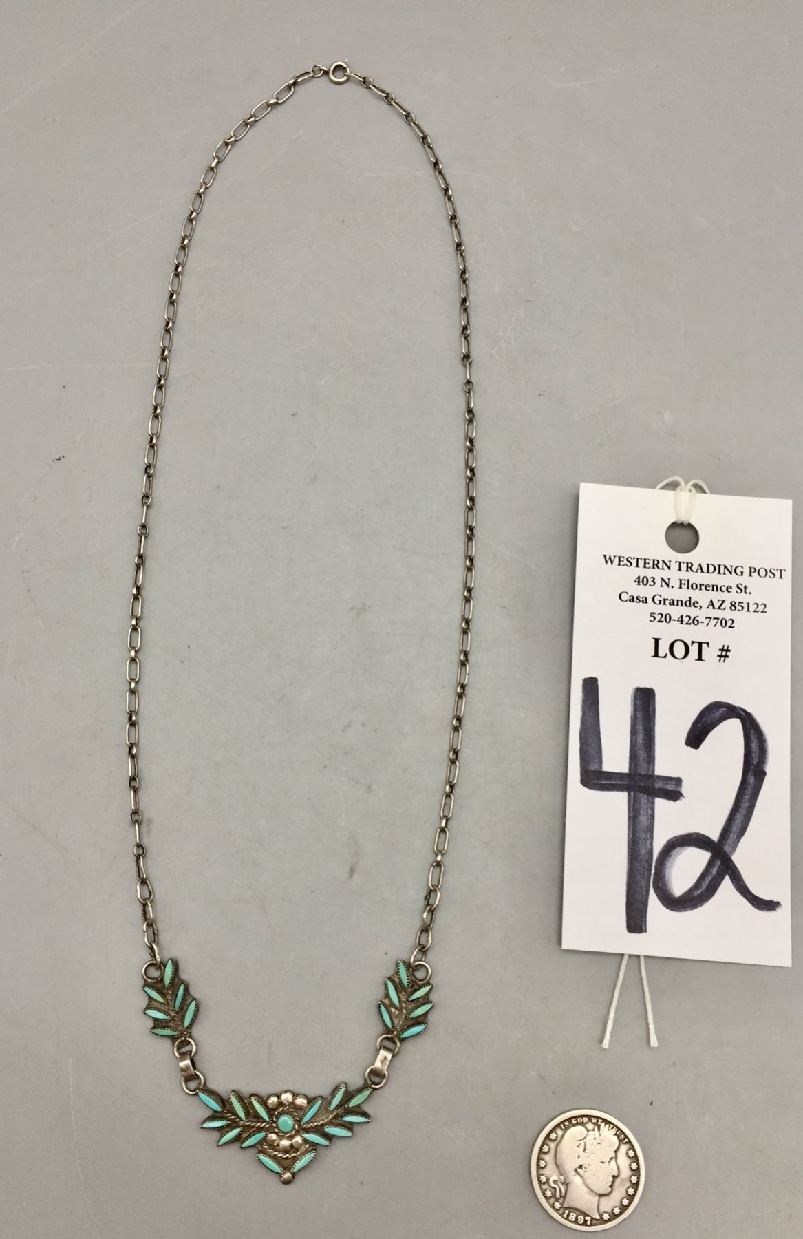 Description: Offered for sale in this lot is this beautiful vintage Zuni needle point necklace. It is set with 27 finely cut turquoise stones in sterling silver. Maker: Unmarked. Approx. Age: Circa 1960s vintage. Size: Fits a 21 inch neck. Weighs 12.5 grams. Condition: Good for its age, normal wear expected. Please look closely at the pictures - they are an important part of our description. Shipping: There will be a $5 handling, packaging fee for shipping this lot. The actual cost of postage will be added on top of that.