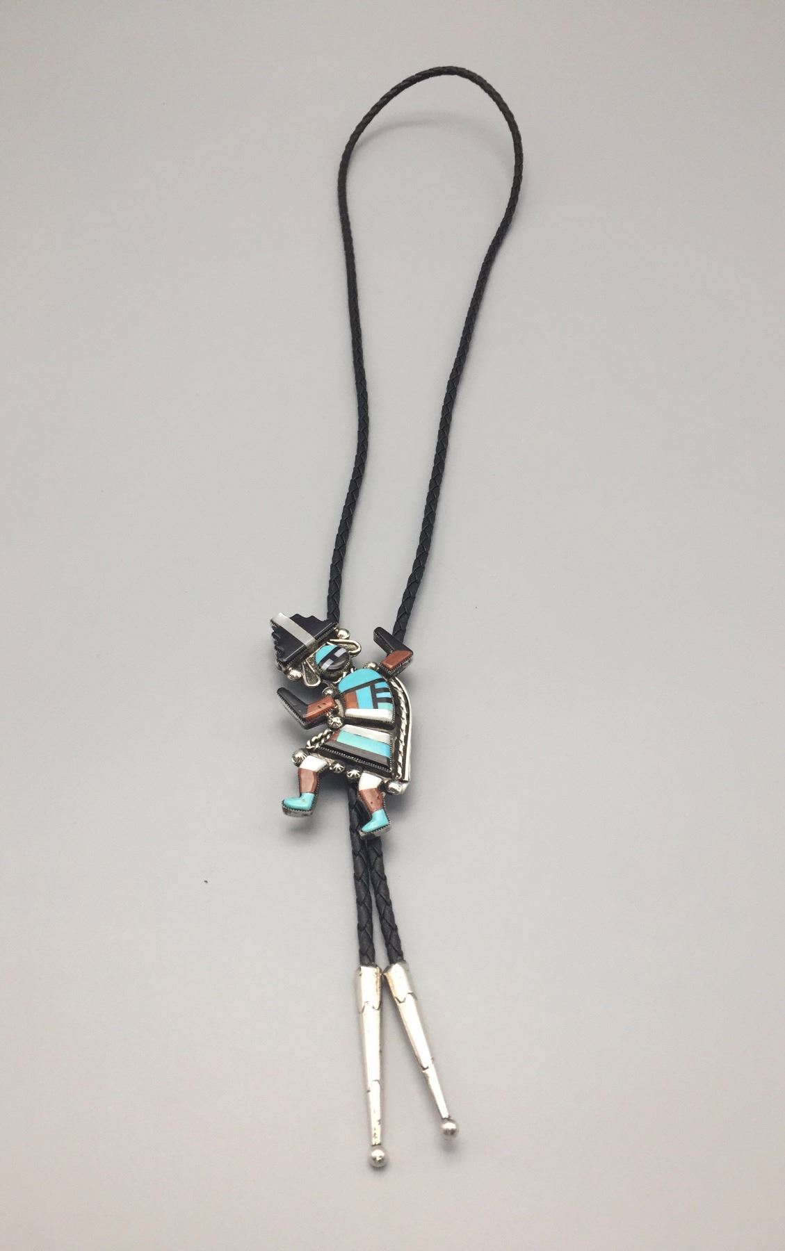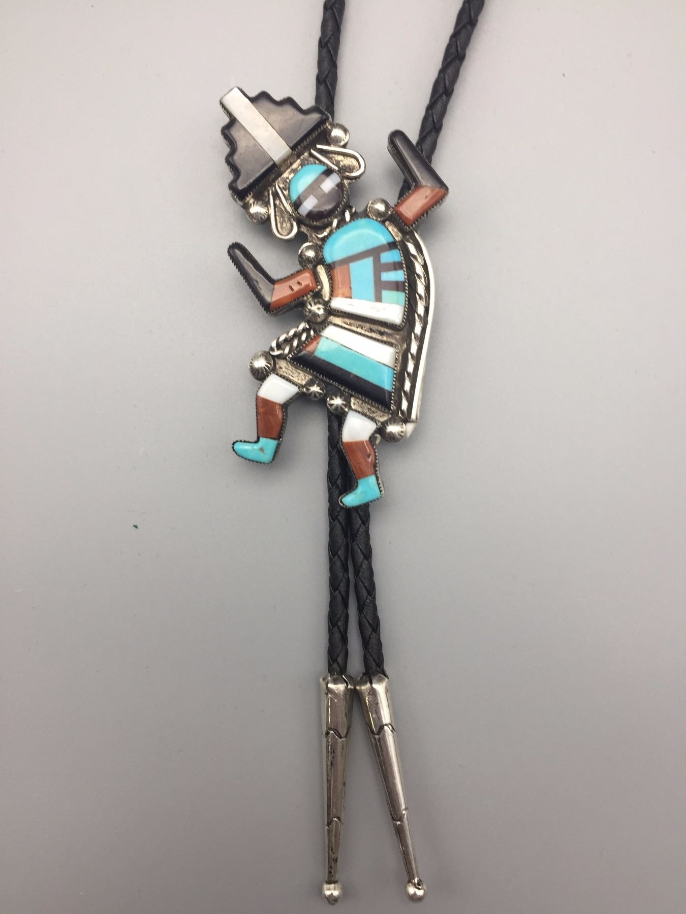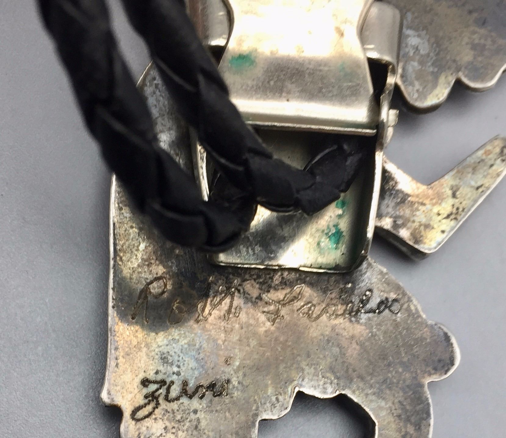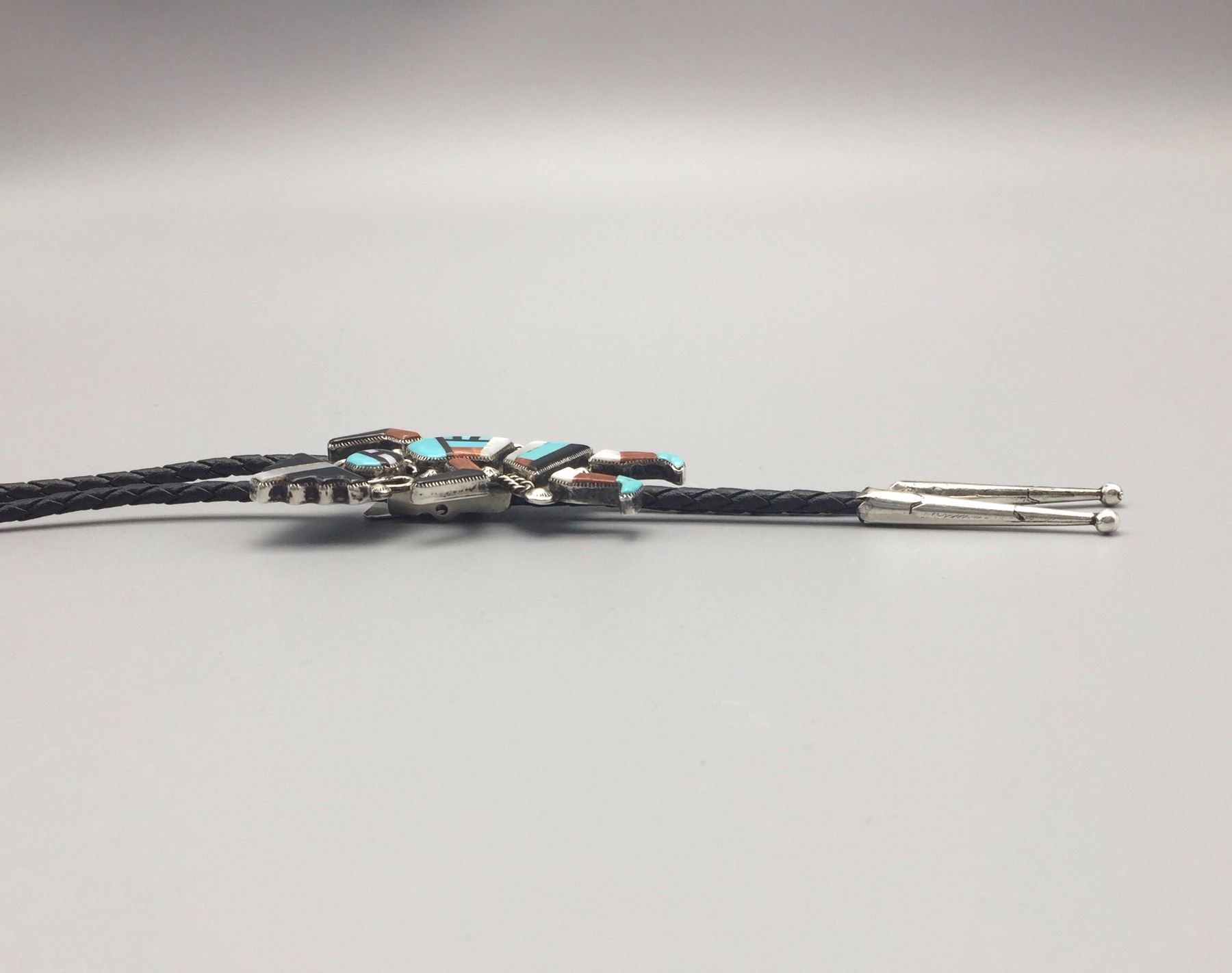 Maker: Appears to read: Robt. Lasiloo, Zuni, etched onto the back of the slide. Approx. Age: Circa 1960s (has a Bennett C-31 clasp on the back). Size: Slide measures 1 7/8” w x 2 3/4” h, cord is 36” overall. Weighs 37.3 g. Additional Info: Nice turquoise, coral, MOP, onyx and sterling bolo on a braided black cord with sterling tips. Condition: Good, normal wear expected. Please look closely at the pictures - they are an important part of our description. Shipping: There will be a $5 handling / packaging fee for shipping this lot. The actual cost of postage will be added on top of that.