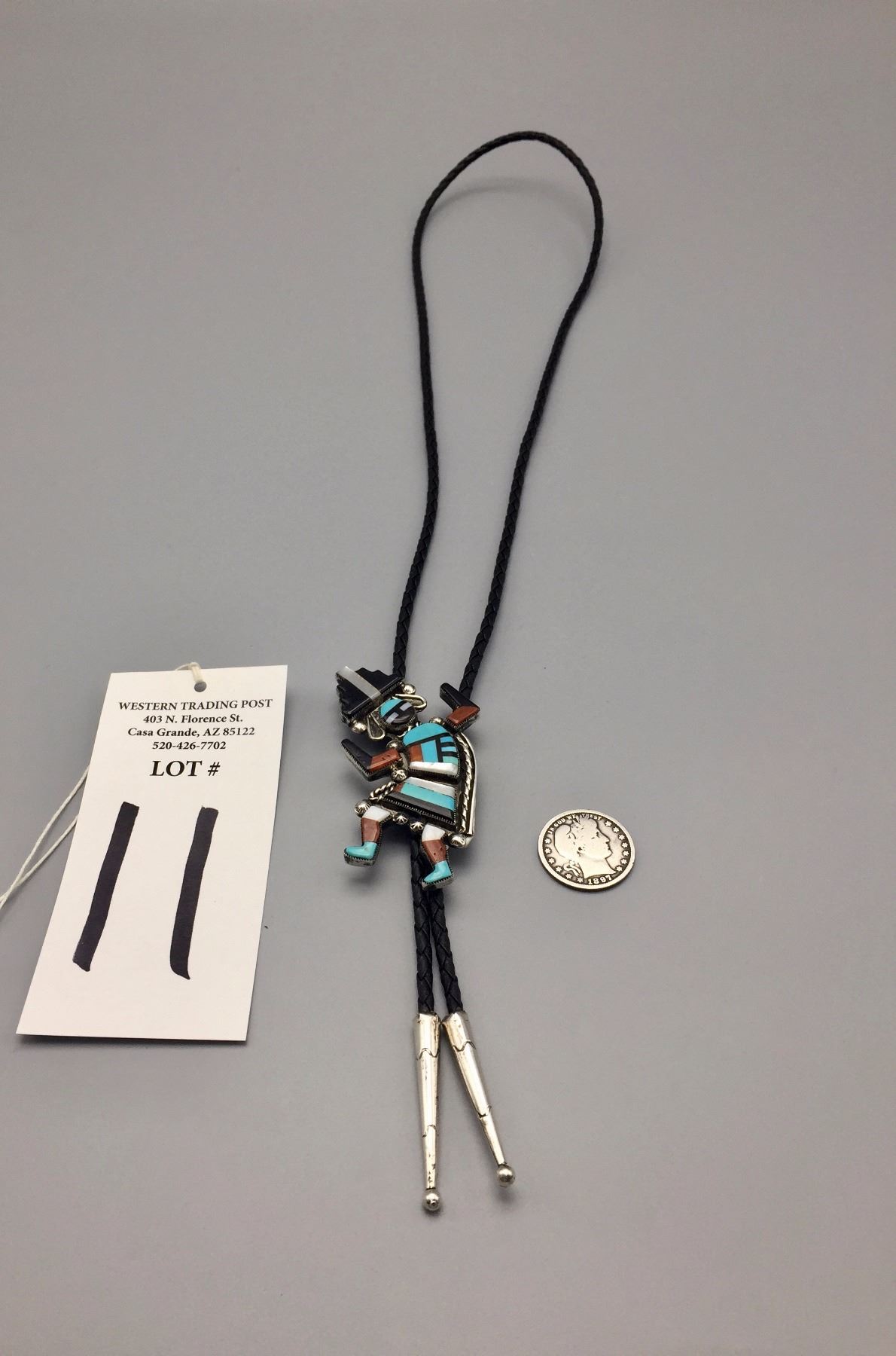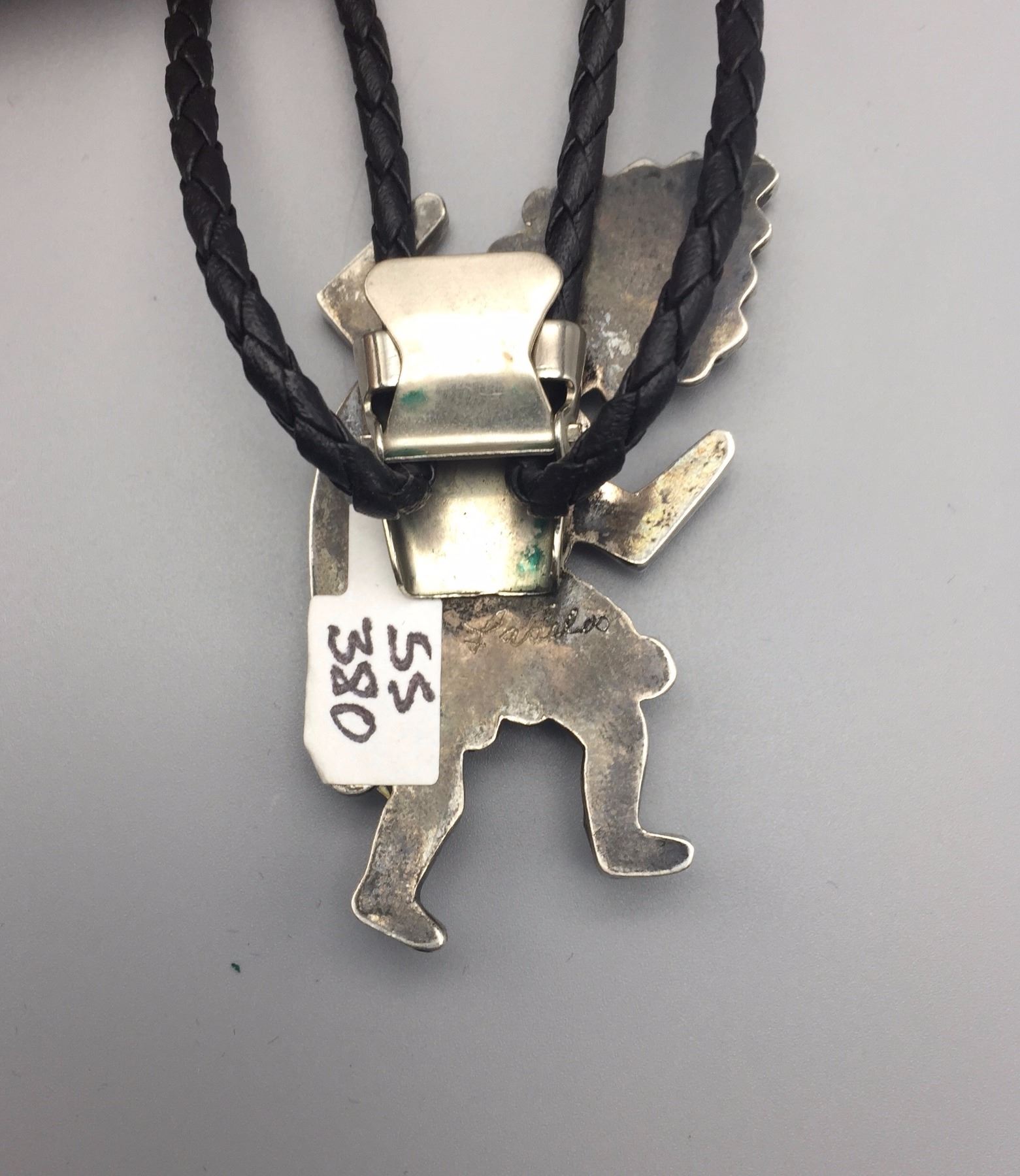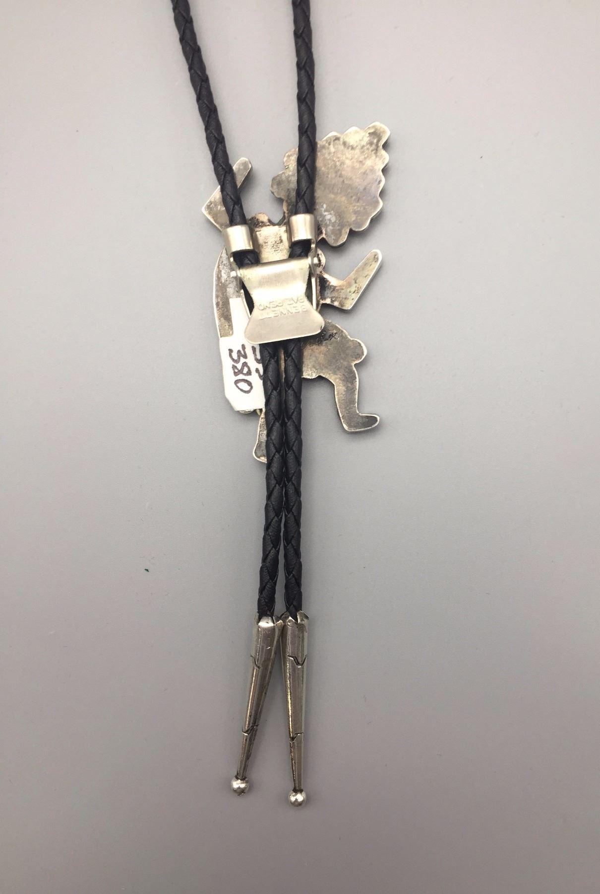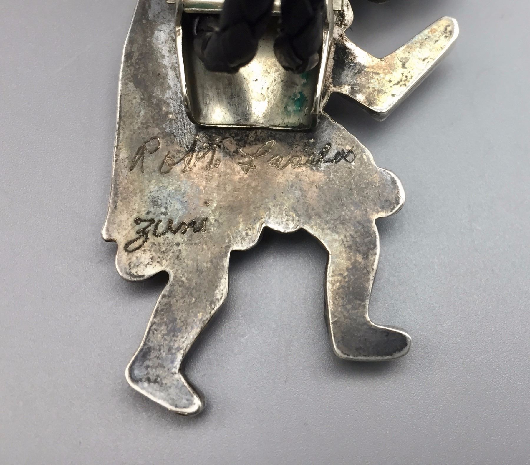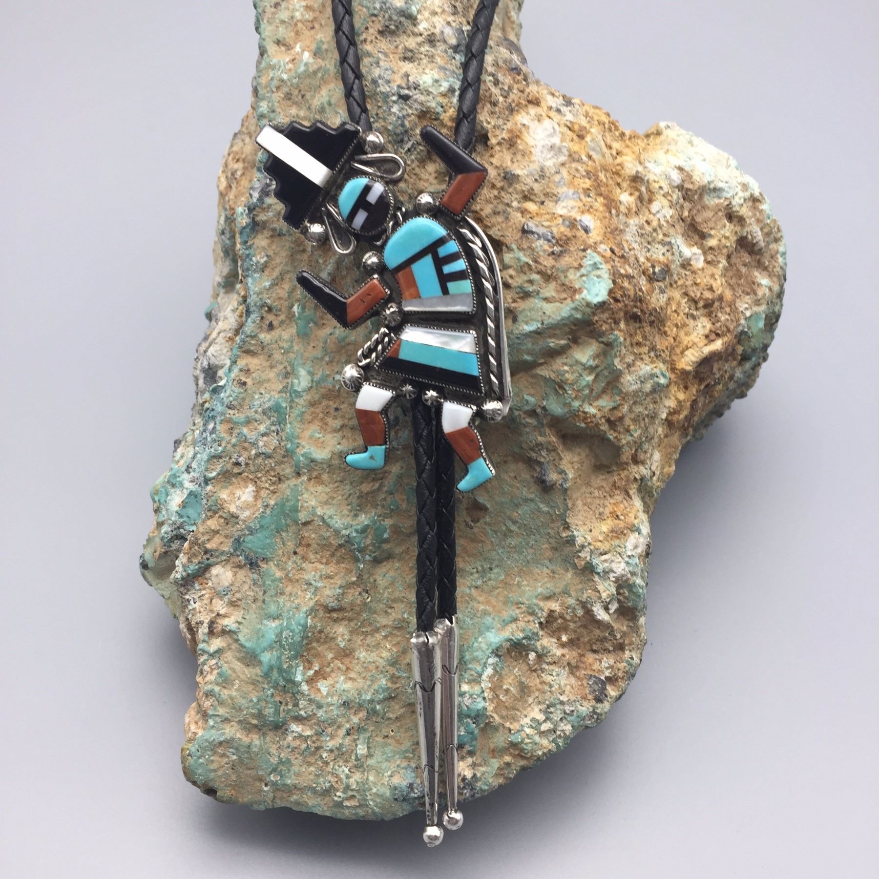 Maker: Appears to read: Robt. Lasiloo, Zuni, etched onto the back of the slide. Approx. Age: Circa 1960s (has a Bennett C-31 clasp on the back). Size: Slide measures 1 7/8” w x 2 3/4” h, cord is 36” overall. Weighs 37.3 g. Additional Info: Nice turquoise, coral, MOP, onyx and sterling bolo on a braided black cord with sterling tips. Condition: Good, normal wear expected. Please look closely at the pictures - they are an important part of our description. Shipping: There will be a $5 handling / packaging fee for shipping this lot. The actual cost of postage will be added on top of that.