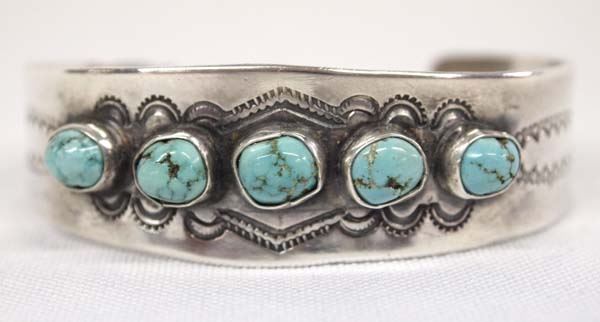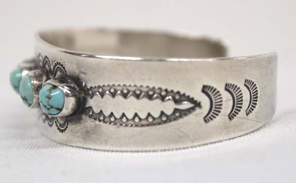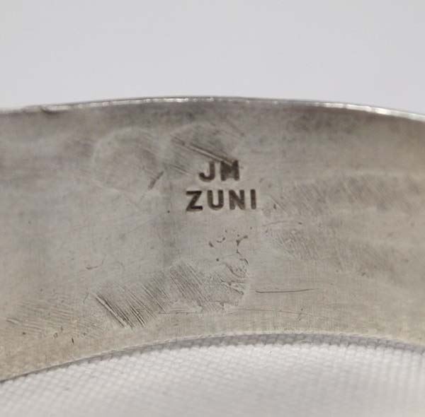 Vintage Native American Zuni Sterling Silver Turquoise Bracelet by Juan Martinez, older piece hallmarked JM Zuni, sterling silver set with turquoise cabochons, beautifully stamped details, inside measures 6.25'' which includes opening x .75''W, very traditional style, 23.13g in total wt.