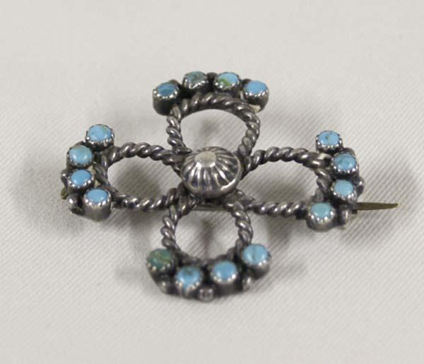 Vintage Zuni Pin, measures approx. 1.5'' x 1.5'', silver and turquoise. SHI $15.