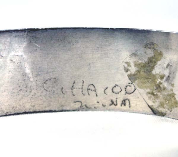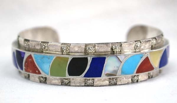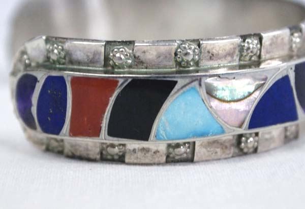 Vintage Native American Zuni Sterling Bracelet by Carmichael Haloo, signed by artist, sterling silver set with inlay of turquoise, coral, lapis, mother of pearl, spiny oyster, and jet, inside measures 6.5'' which includes opening x 5/8''W, 23.75g in total wt.