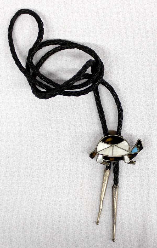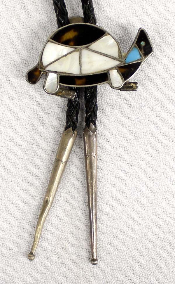 Vintage/Antique Native American Zuni Sterling Inlay Turtle Bolo Tie, slide measures 1'' x 2'', sterling aglets, mother of pearl and turquoise