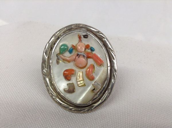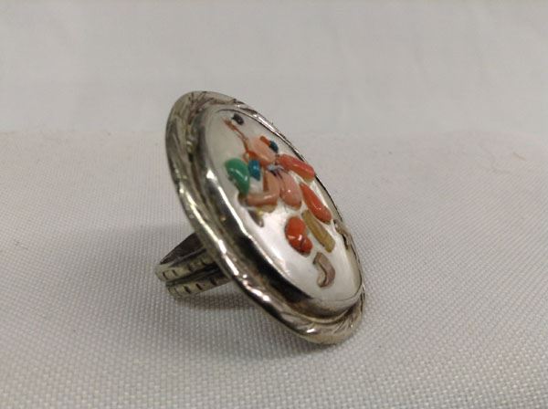 Vintage Zuni Sterling Silver Stone Overlay Ring, Size 7.5, overlay stones consist of coral, jet, turquoise, and abalone on oval mother of pearl cabochon, measures 1.5"L x 1 1/8"W, hallmarked TW, 11.07g in total wt.