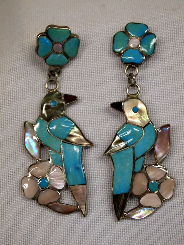 Vintage Zuni Sterling & Turquoise Bird Earrings. Beautiful, well-made hand crafted vintage sterling silver with turquoise, jet and shell inlay. No hallmark. Measures 2 1/2''.