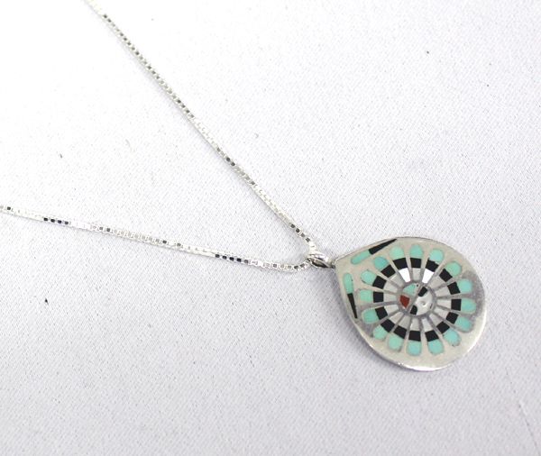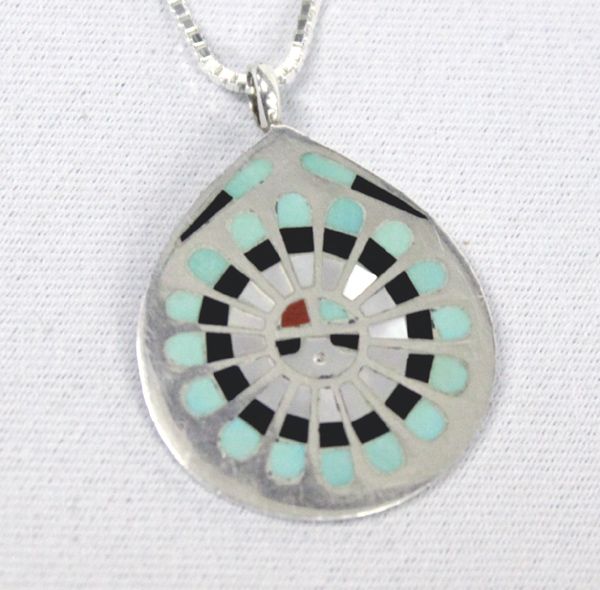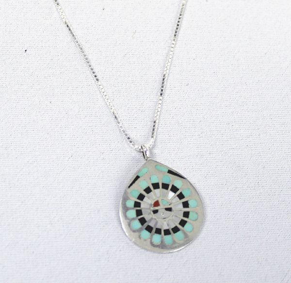 Vintage Native American Zuni Sterling Turquoise stone-to-stone and channel inlay pendant on a 20'' sterling silver chain, design is the traditional Zuni sun face inlay with turquoise, black jet, mother-of-pearl, and coral, pendant measures 1.25'' x 1'' and is signed on back ''Q. Peynetsa Zuni NM'', weight is 4.4 grams.