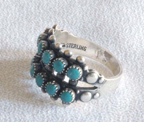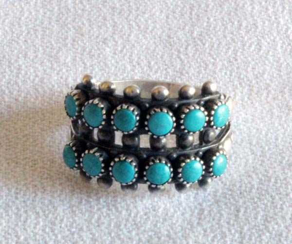 Vintage 1970's Zuni Sterling Turquoise Ring, Size 7, measures .5''W, sterling silver with petit point set blue green turquoise cabochons (measuring 1/8''D), stamped sterling, very traditional, 5.32g in total wt.
