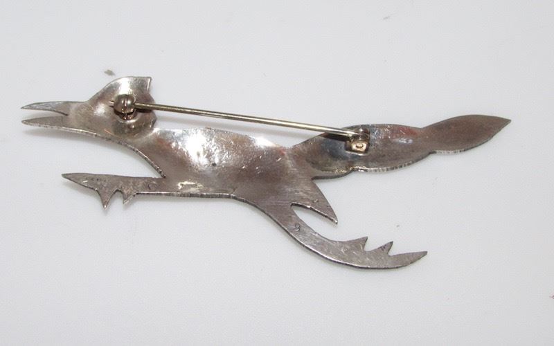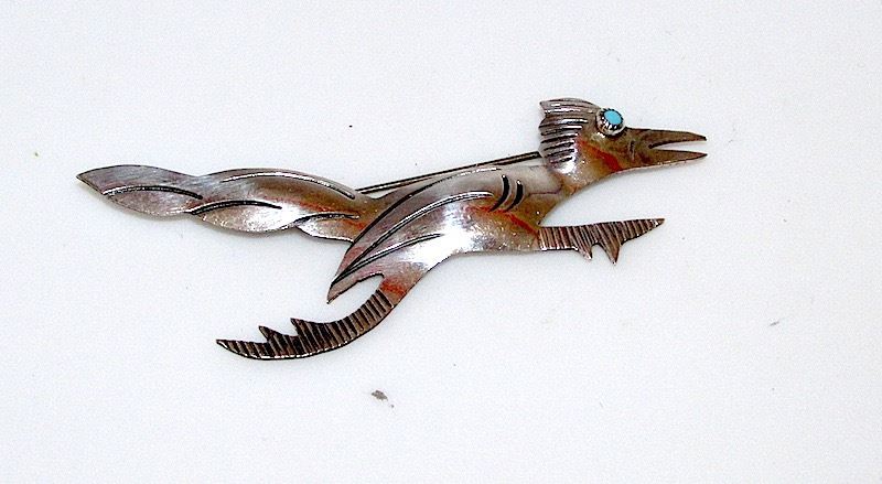 Vintage Zuni Sterling Turquoise Road Runner Pin, measures about 2" long, marked