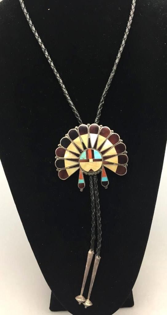 Description: Offered for sale in this lot is a vintage Zuni Sunface bolo tie, set with shell, turquoise, and coral. Maker: Unmarked. Approx. Age: Circa 1960s. Size: Cord measures 38 inches long. Slide measures 3 inches long X 3-1/4 inches wide. Weighs 58.9 grams. Condition: Good for its age, normal wear expected. Please look closely at the pictures - they are an important part of our description. Shipping: There will be a $5 handling / packaging fee for shipping this lot. The actual cost of postage will be added on top of that.