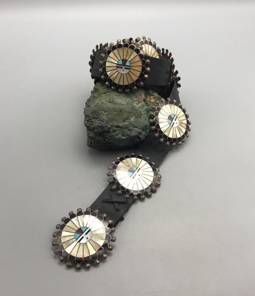 Description: This is a beautiful vintage Zuni inlay concho belt. It features the classic sunface design and is set with shell, turquoise, coral, and black onyx set on black leather. It is sterling silver. Maker: Abel S, Abel Soseeah (Zuni). Active since the 1970s. Approx. Age: Circa 1970s. Size: The conchos measure 2-5/8 inches wide X 2-5/8 inches long. The buckle is 2-5/8 inches wide X 2-5/8 inches long. The belt itself is 41-1/2 inches long overall. Weight is approx. 402.2 g. which would include everything. Condition: Good for its age. Normal wear and minor imperfections expected on used and vintage items. Please look closely at the pictures as they are an important part of our description. Shipping: There will be a $5 handling / packaging fee for shipping this lot. The actual cost of postage will be added on top of that. BUY IT NOW: If you would like to buy this item now without waiting for the auction to end (this option is only available up to 48 hours before the auction starts to close), the “Buy it Now” price is the high estimate of this lot. If you would like to end the auction early and pay the high estimate (plus applicable fees), please contact us by phone or email and reference this lot number.