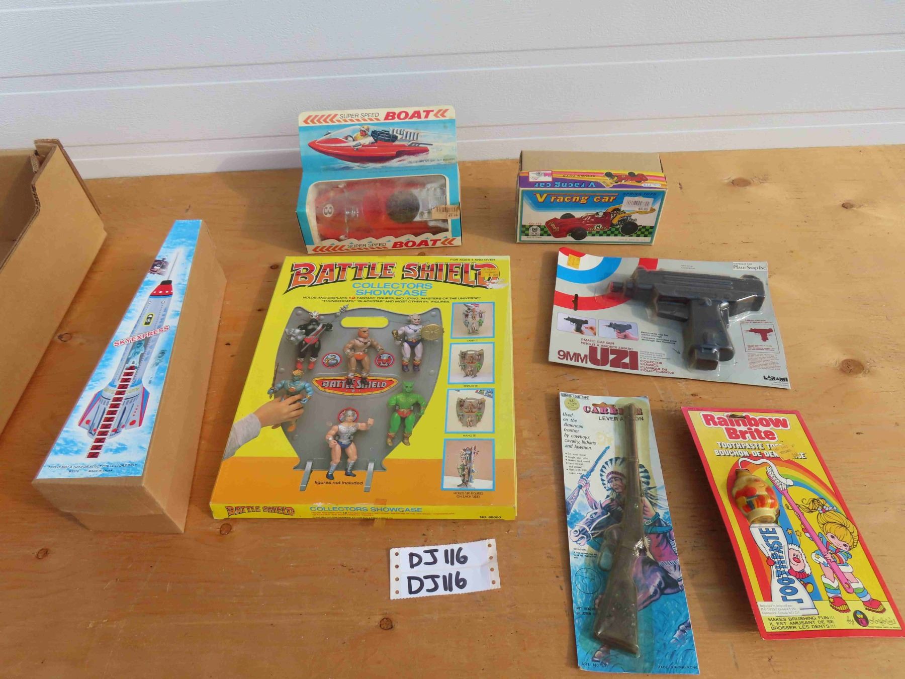 Vintage and Modern Boxed Toys - Rocket, Speed Boat, Race Car, Frontier Gun