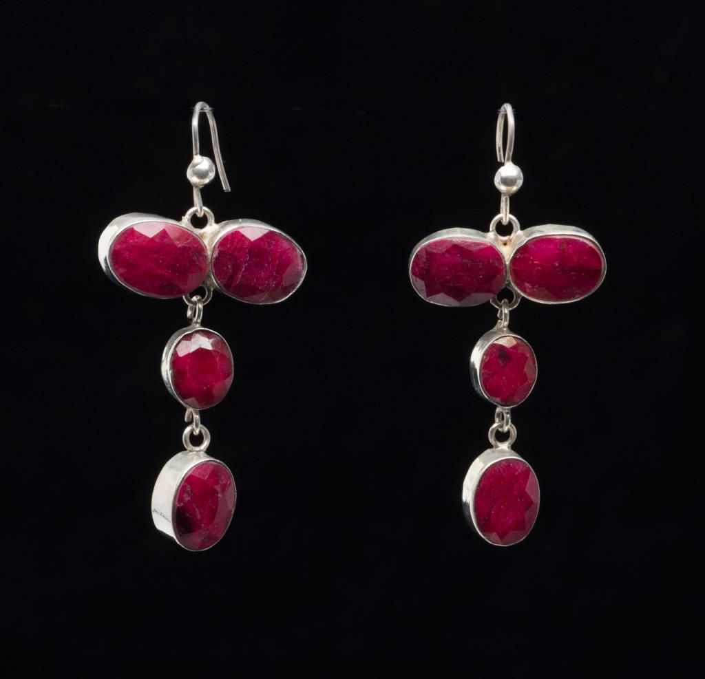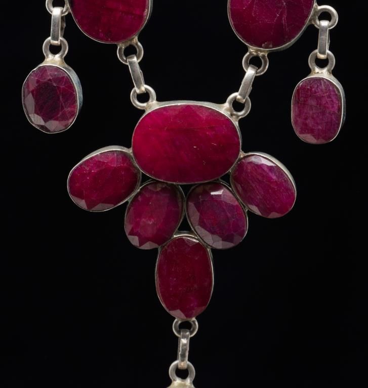 Vintage and custom made natural mizor ruby necklace with matching earrings in sterling silver; 100’s of carats of ruby and several above 6cts each!! Est.: $1,500-$3,000++.