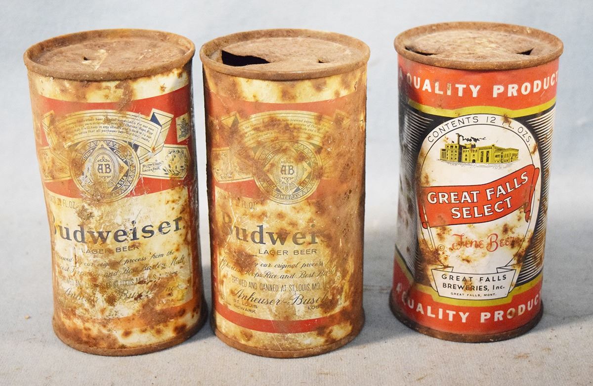 Vintage beer cans: 6 pack of Hamms, 6 pack of Edelweiss, (2) Budweiser & (1) Great Falls Select