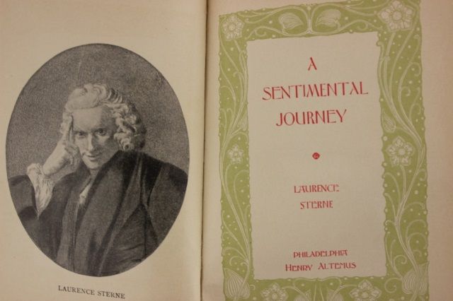 Vintage hardback book titled "A Sentimental Journey" tells of journey through France and Italy. Author is Laurence Sterne. Book has 285 pages.