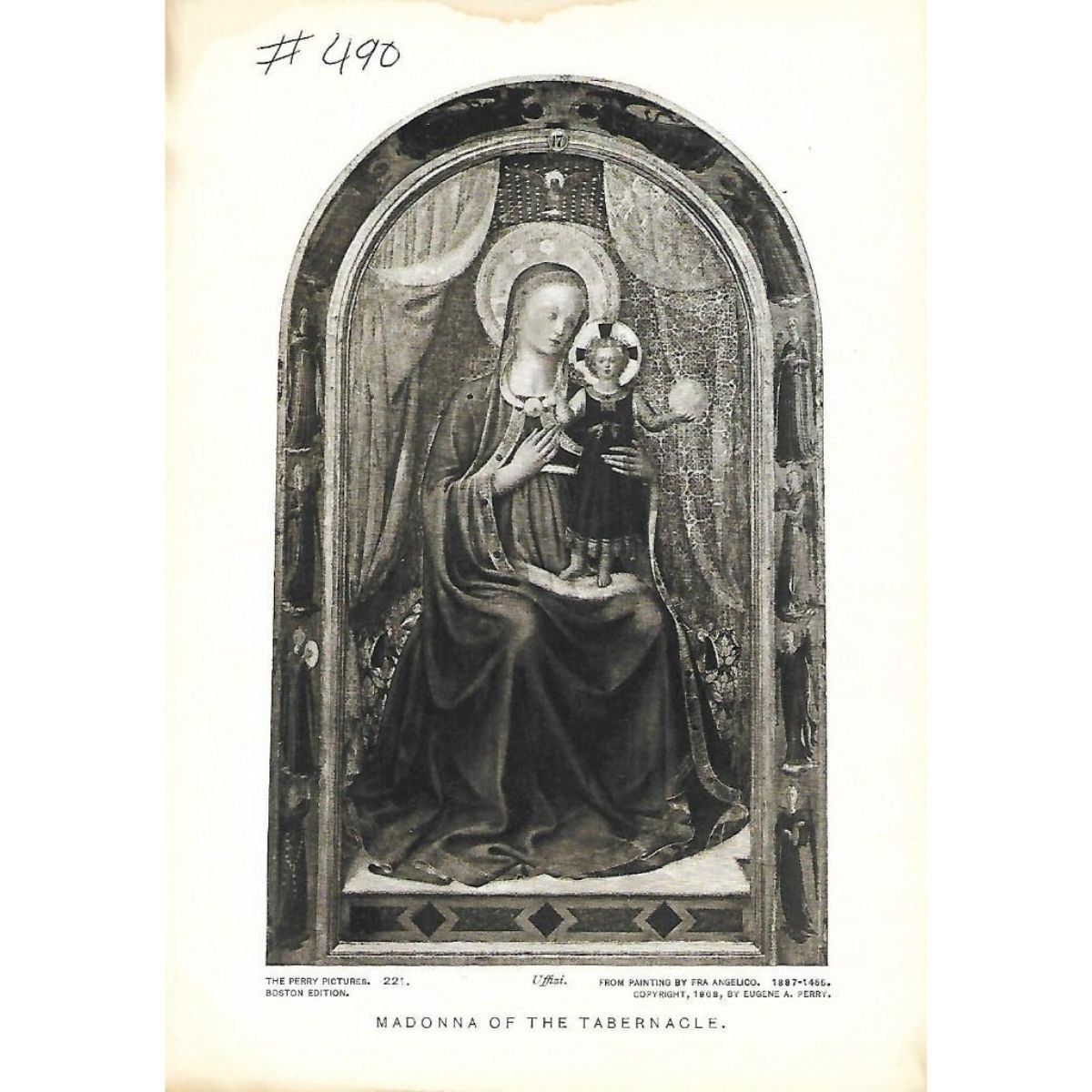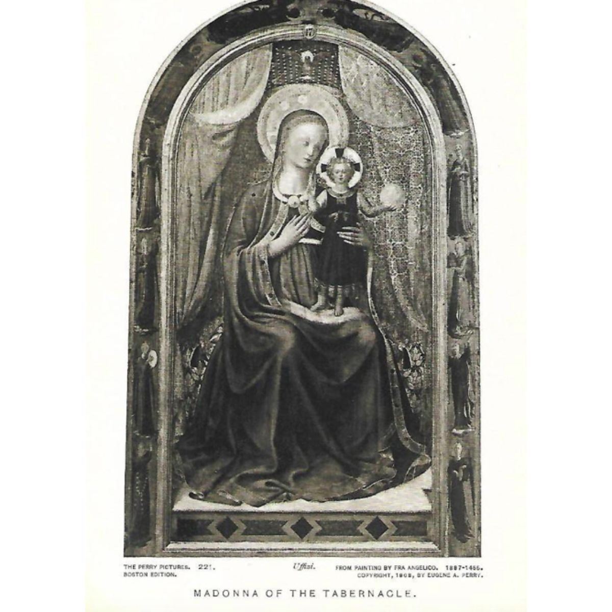 Vintage c.1920’s half-tone print by Perry Pictures, #221 Madonna of the Tabernacle. Uffizi Gallery. From Painting by Fra Angelico (1387-1455). Copyright 1908 by Eugene A. Perry 5 1/2" X 8" print size, suitable for framing. *** Information about Perry Pictures - Eugene Ashton Perry, Master of the Center Grammar School of Malden, Massachusetts, discovered the possibility of making and distributing half-tone reproductions of famous paintings, sculptures & architecture to be sold at reasonable prices so that everyone could afford to own art. Â