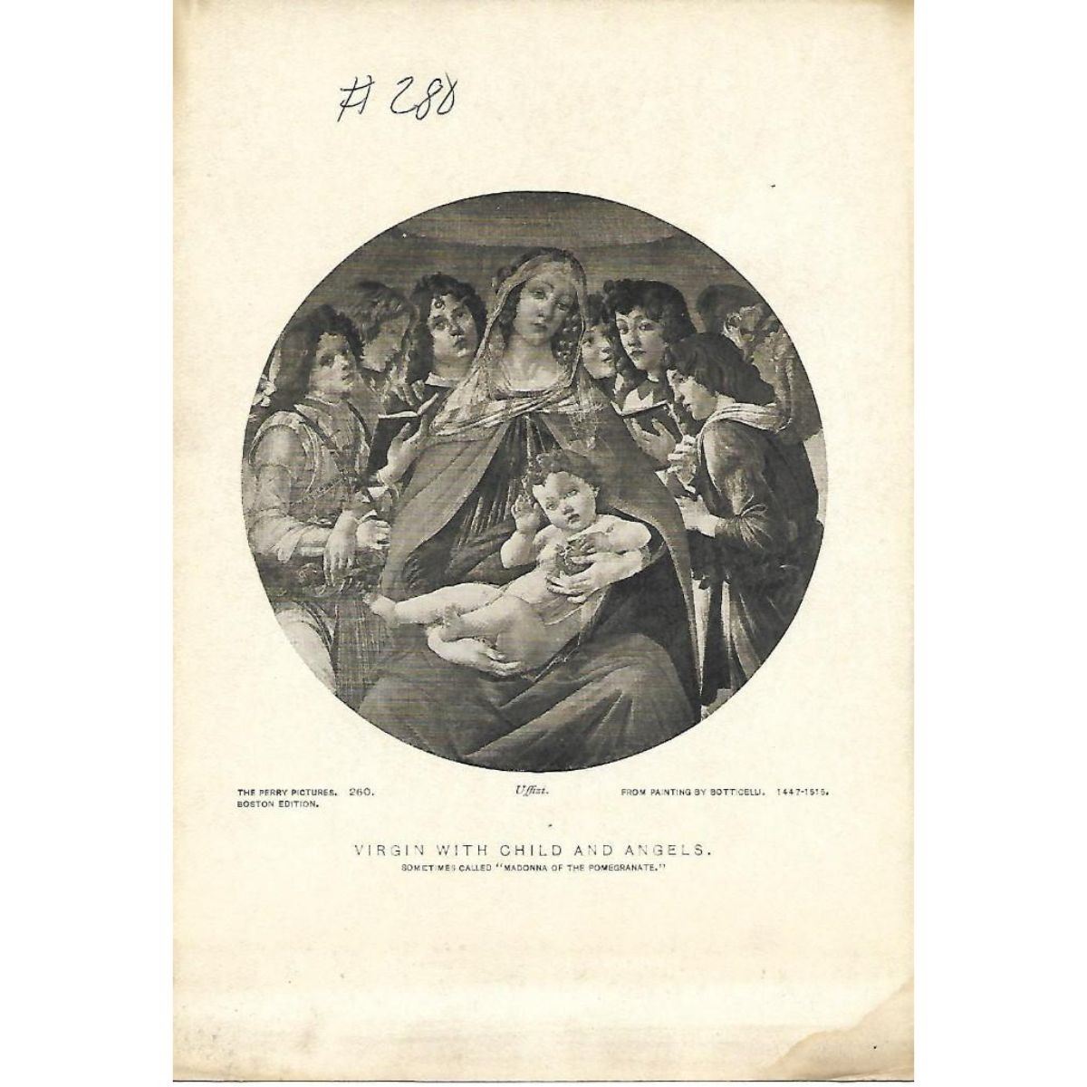 Vintage c.1920’s half-tone print by Perry Pictures, #260 Virgin with Child and Angels, sometimes called "Madonna of the Pomegranate." Uffizi. From Painting by Botticelli (1447-1515). 5 1/2" X 8" print size, suitable for framing. *** Information about Perry Pictures - Eugene Ashton Perry, Master of the Center Grammar School of Malden, Massachusetts, discovered the possibility of making and distributing half-tone reproductions of famous paintings, sculptures & architecture to be sold at reasonable prices so that everyone could afford to own art. Â