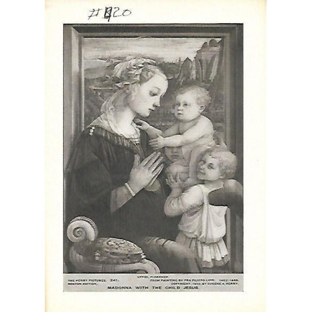 Vintage c1920’s half-tone print by Perry Pictures, #241 Madonna with the Child Jesus. Uffizi, Florence. From Painting by Fra Filippo Lippi (1402-1469) copyright 1916 by Eugene A. Perry 5 1/2" X 8" print size, suitable for framing. *** Information about Perry Pictures - Eugene Ashton Perry, Master of the Center Grammar School of Malden, Massachusetts, discovered the possibility of making and distributing half-tone reproductions of famous paintings, sculptures & architecture to be sold at reasonable prices so that everyone could afford to own art. Â