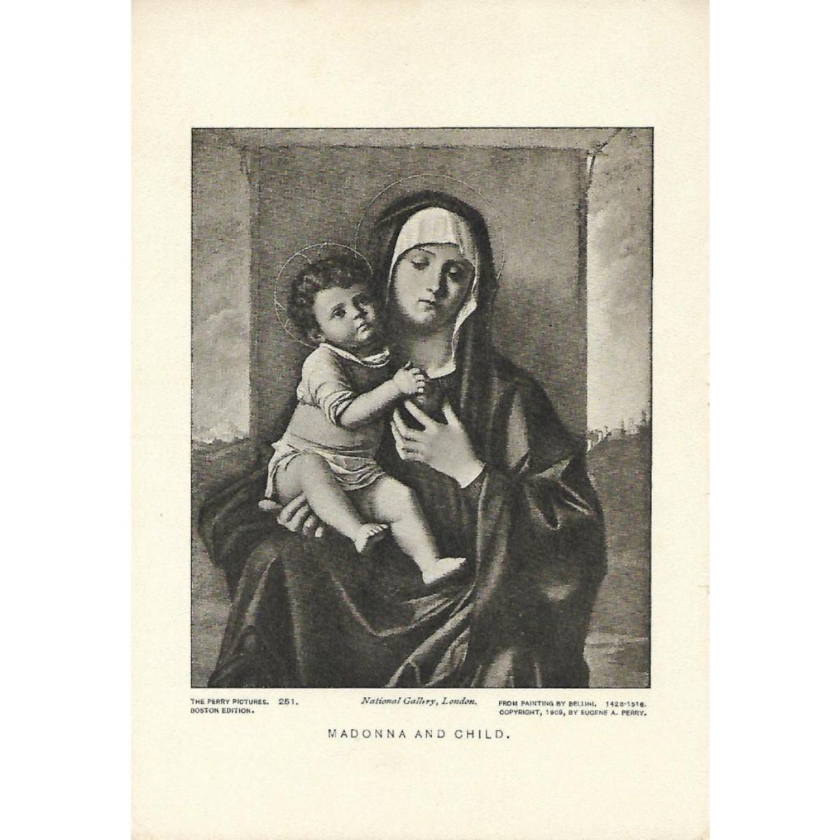 Vintage c1920’s half-tone print by Perry Pictures, #251 Madonna & Child. National Gallery, London. From Painting By Bellini 1428-1516) copyright 1909 by Eugene A. Perry. 5 1/2" X 8" print size, suitable for framing. *** Information about Perry Pictures - Eugene Ashton Perry, Master of the Center Grammar School of Malden, Massachusetts, discovered the possibility of making and distributing half-tone reproductions of famous paintings, sculptures & architecture to be sold at reasonable prices so that everyone could afford to own art. Â