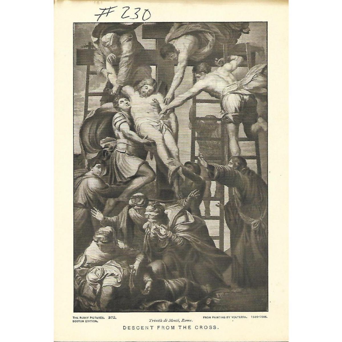 Vintage c1920’s half-tone print by Perry Pictures, #372 Descent from the Cross. Trinita de Monti, Rome. From Painting by Volterra (1509-1566) 5 1/2" X 8" print size, suitable for framing. *** Information about Perry Pictures - Eugene Ashton Perry, Master of the Center Grammar School of Malden, Massachusetts, discovered the possibility of making and distributing half-tone reproductions of famous paintings, sculptures & architecture to be sold at reasonable prices so that everyone could afford to own art. Â