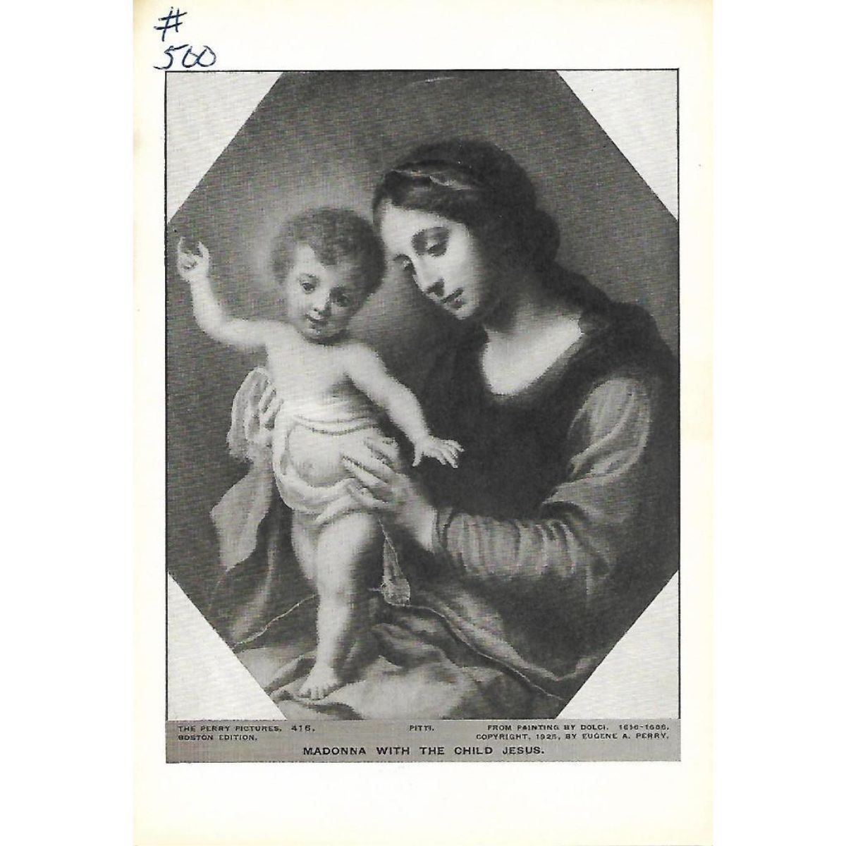 Vintage c1920’s half-tone print by Perry Pictures, #416 Madonna with the Child Jesus. Pitti. From Painting by Dolci (1616-1686). 5 1/2" X 8" print size, suitable for framing. *** Information about Perry Pictures - Eugene Ashton Perry, Master of the Center Grammar School of Malden, Massachusetts, discovered the possibility of making and distributing half-tone reproductions of famous paintings, sculptures & architecture to be sold at reasonable prices so that everyone could afford to own art. Â