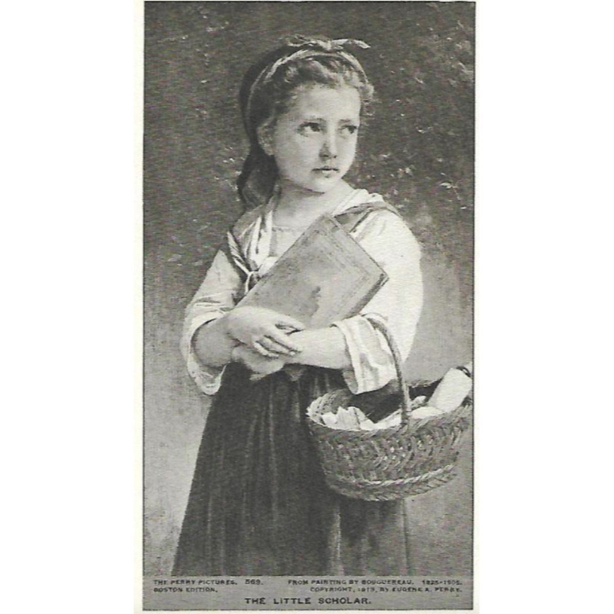 Vintage c.1920’s half-tone print by Perry Pictures, #569 The Little Scholar. From Painting by Bouguereau (1825-1905). Copyright 1913 by Eugene A. Perry