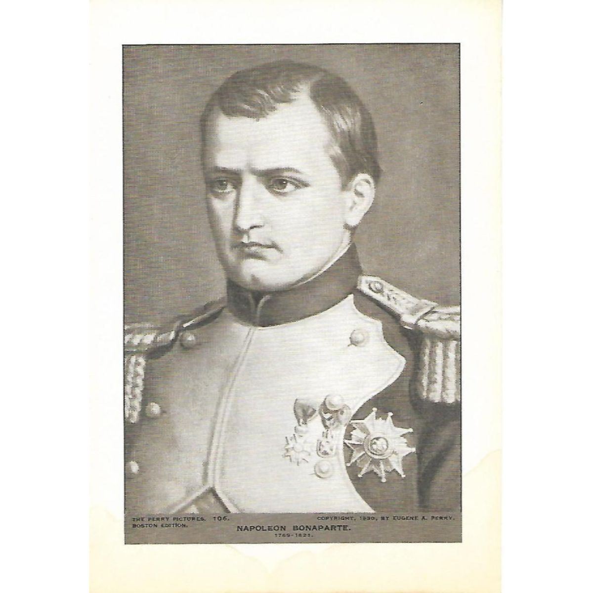 Vintage c1920’s half-tone print by Perry Pictures, #105 Napolean Bonaparte, 1769-1821. copyright 1930 by Eugene A. Perry. 5 1/2" X 8" print size, suitable for framing. *** Information about Perry Pictures - Eugene Ashton Perry, Master of the Center Grammar School of Malden, Massachusetts, discovered the possibility of making and distributing half-tone reproductions of famous paintings, sculptures & architecture to be sold at reasonable prices so that everyone could afford to own art. Â