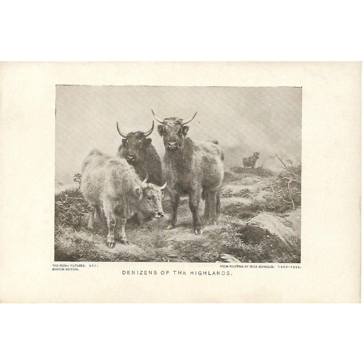 Vintage c1920’s half-tone print, #547 Denizens of the Highlands. From Painting by Rosa Bonseur 1822-1899 5 1/2" X 8" print size, suitable for framing. *** Information about Perry Pictures - Eugene Ashton Perry, Master of the Center Grammar School of Malden, Massachusetts, discovered the possibility of making and distributing half-tone reproductions of famous paintings, sculptures & architecture to be sold at reasonable prices so that everyone could afford to own art. Â