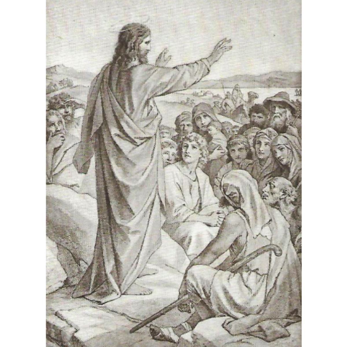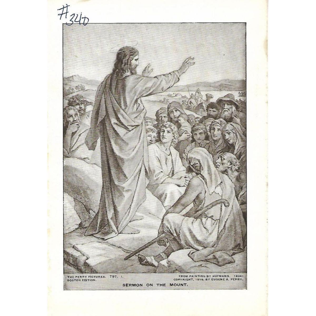 Vintage c1920’s half-tone print, #797i Sermon of the Mount. From Painting by Hofmann 1824- . Copyright by Eugene A. Perry 5 1/2" X 8" print size, suitable for framing. *** Information about Perry Pictures - Eugene Ashton Perry, Master of the Center Grammar School of Malden, Massachusetts, discovered the possibility of making and distributing half-tone reproductions of famous paintings, sculptures & architecture to be sold at reasonable prices so that everyone could afford to own art. Â
