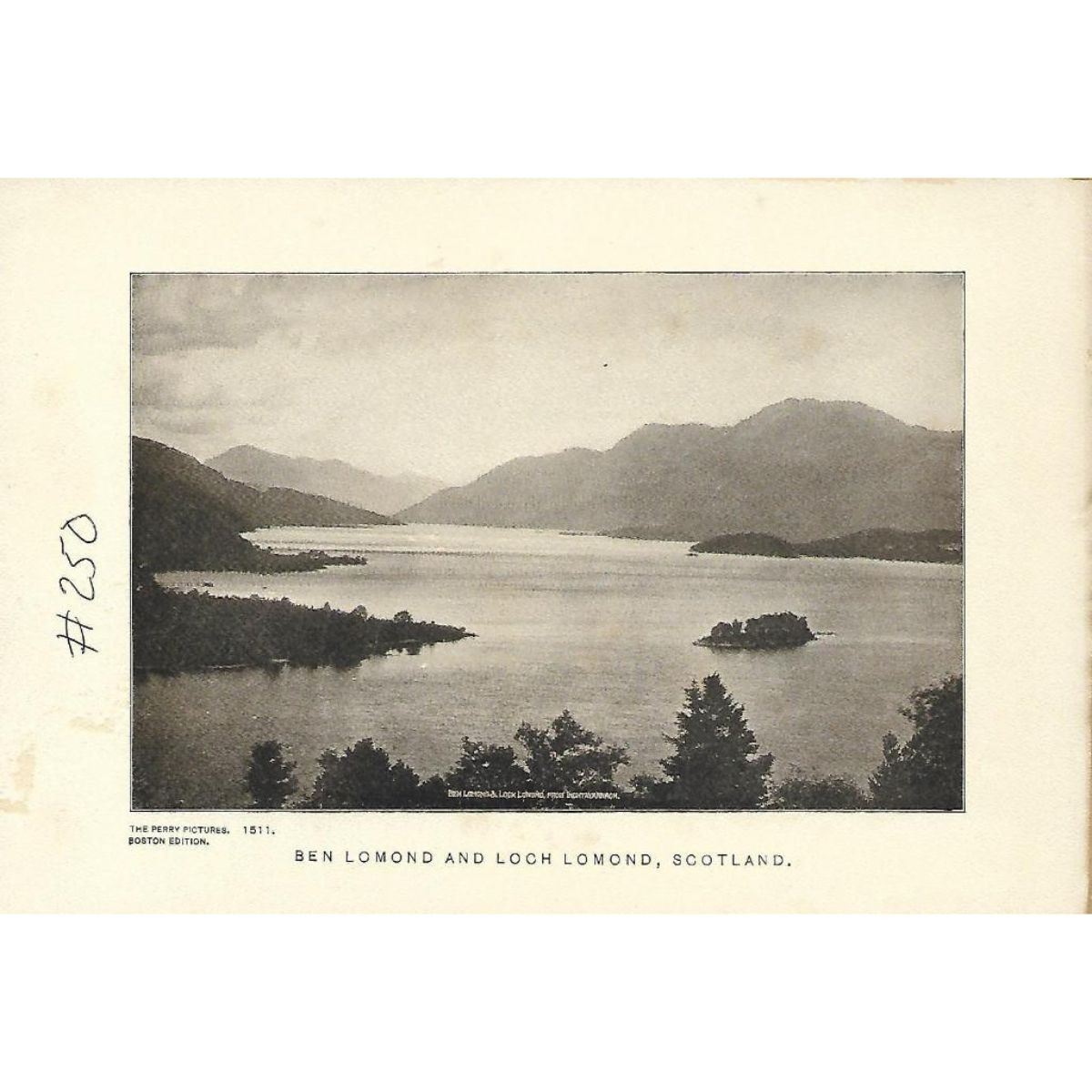 Vintage c1920’s half-tone print by Perry Pictures, #1511 Ben Lomond and Loch Lomond, Scotland 5 1/2" X 8" print size, suitable for framing. *** Information about Perry Pictures - Eugene Ashton Perry, Master of the Center Grammar School of Malden, Massachusetts, discovered the possibility of making and distributing half-tone reproductions of famous paintings, sculptures & architecture to be sold at reasonable prices so that everyone could afford to own art. Â