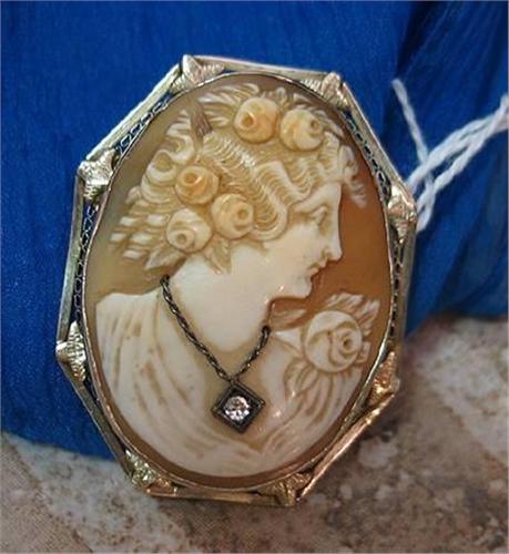 Vintage cameo with diamond in a 14kt white gold filigree pin 43x34mm