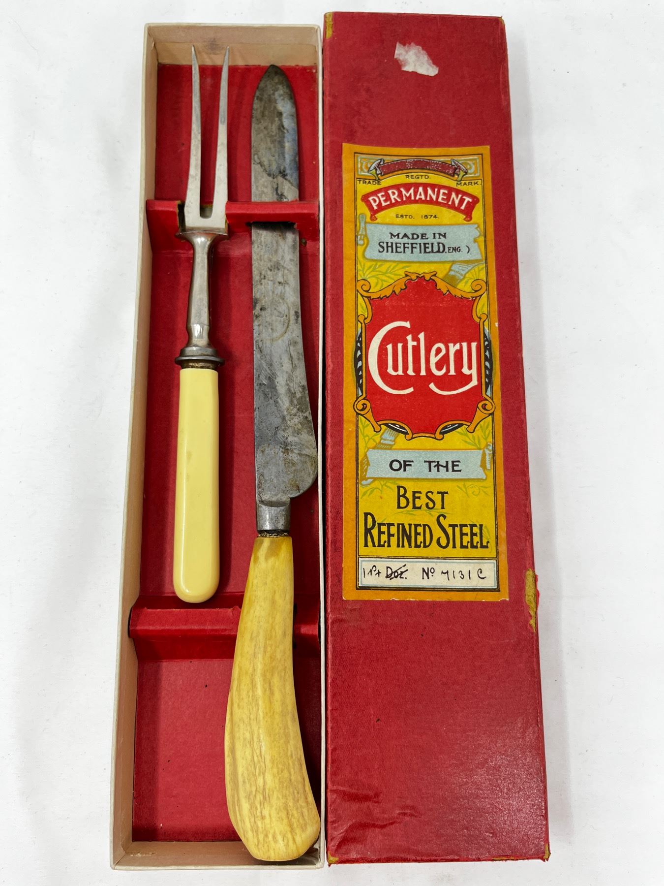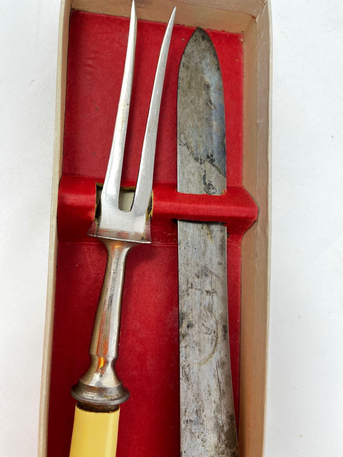 Harrison Brothers bone handle knife with missmatched carving prong. In vintage box.
