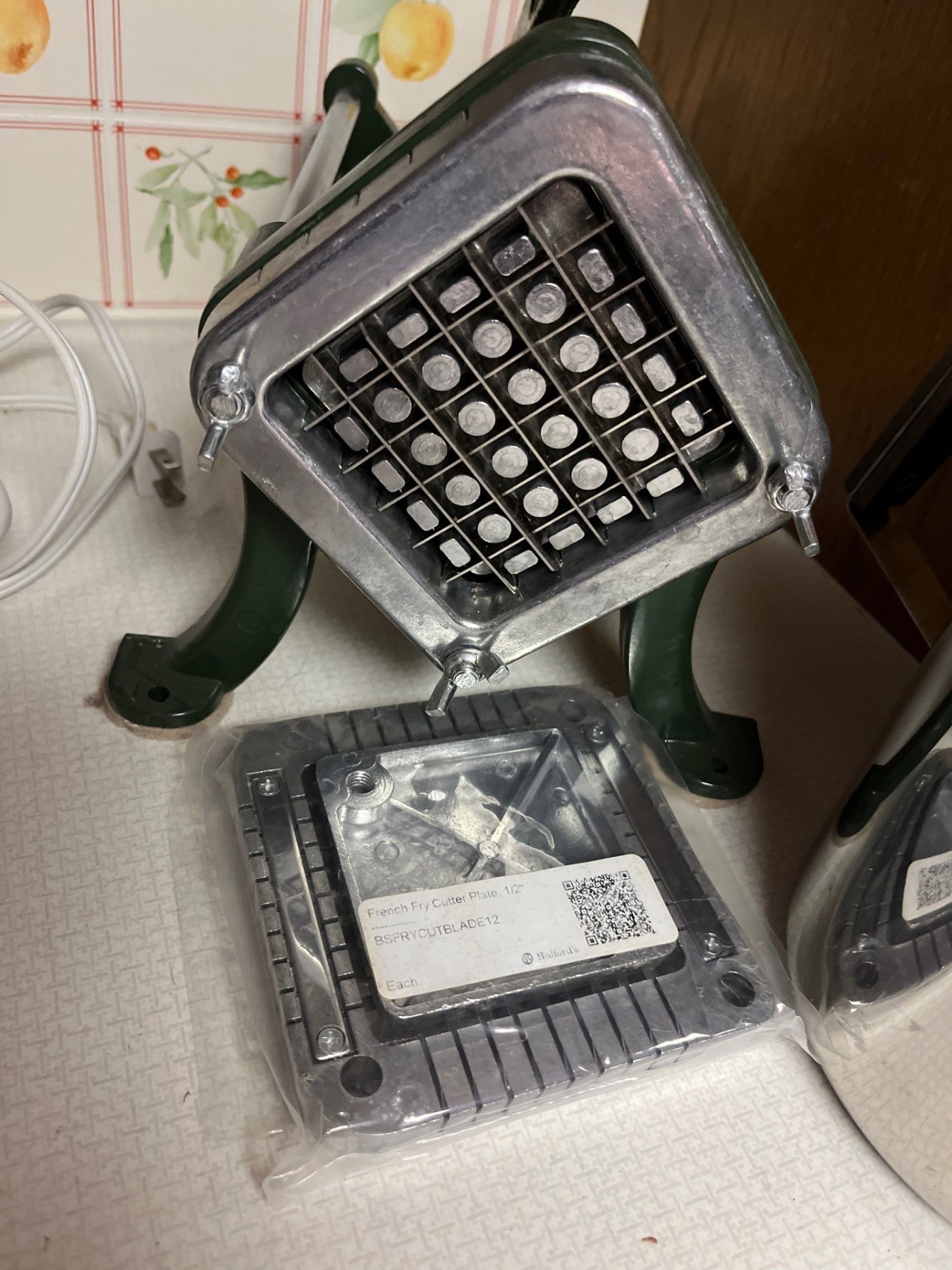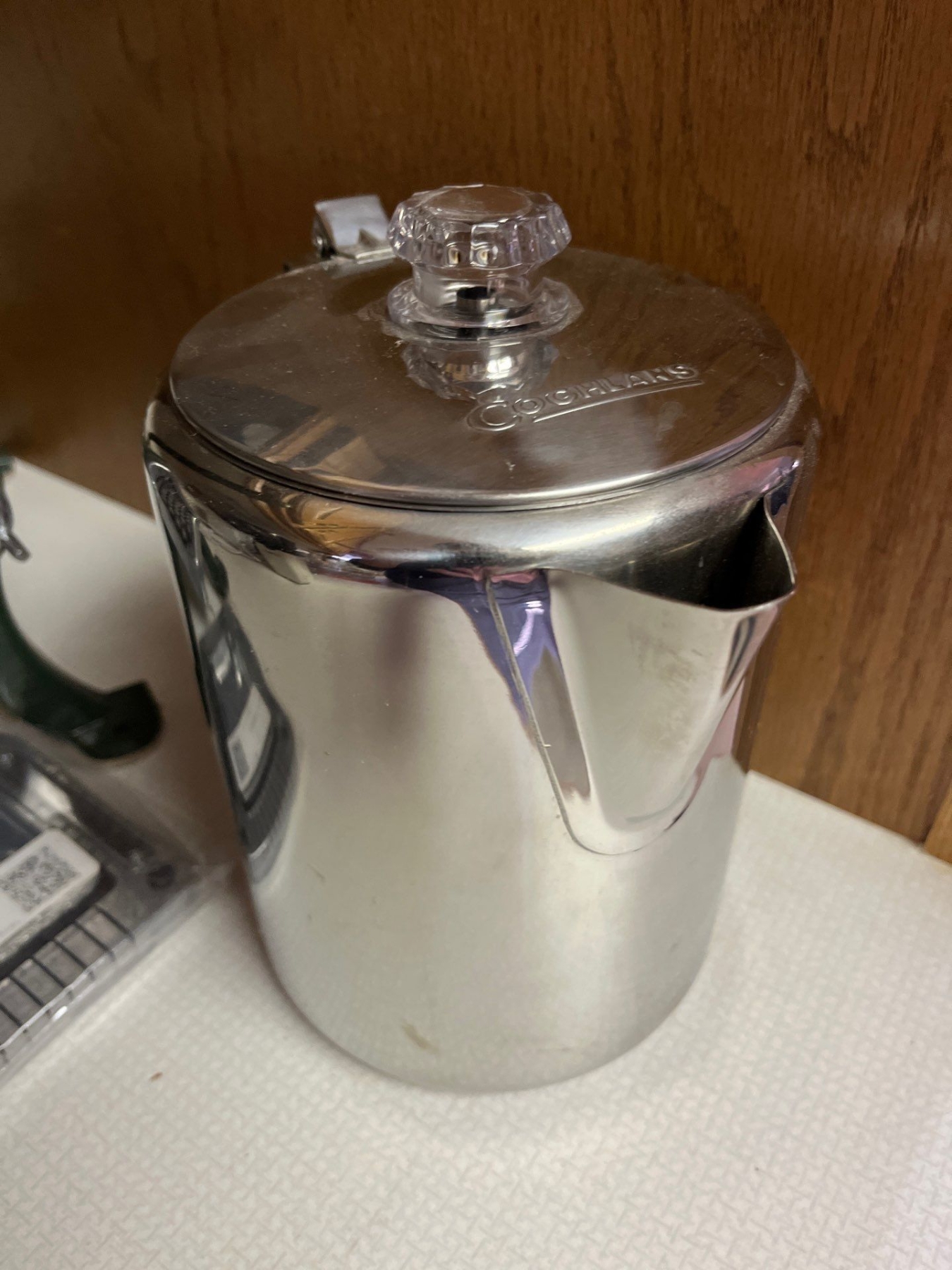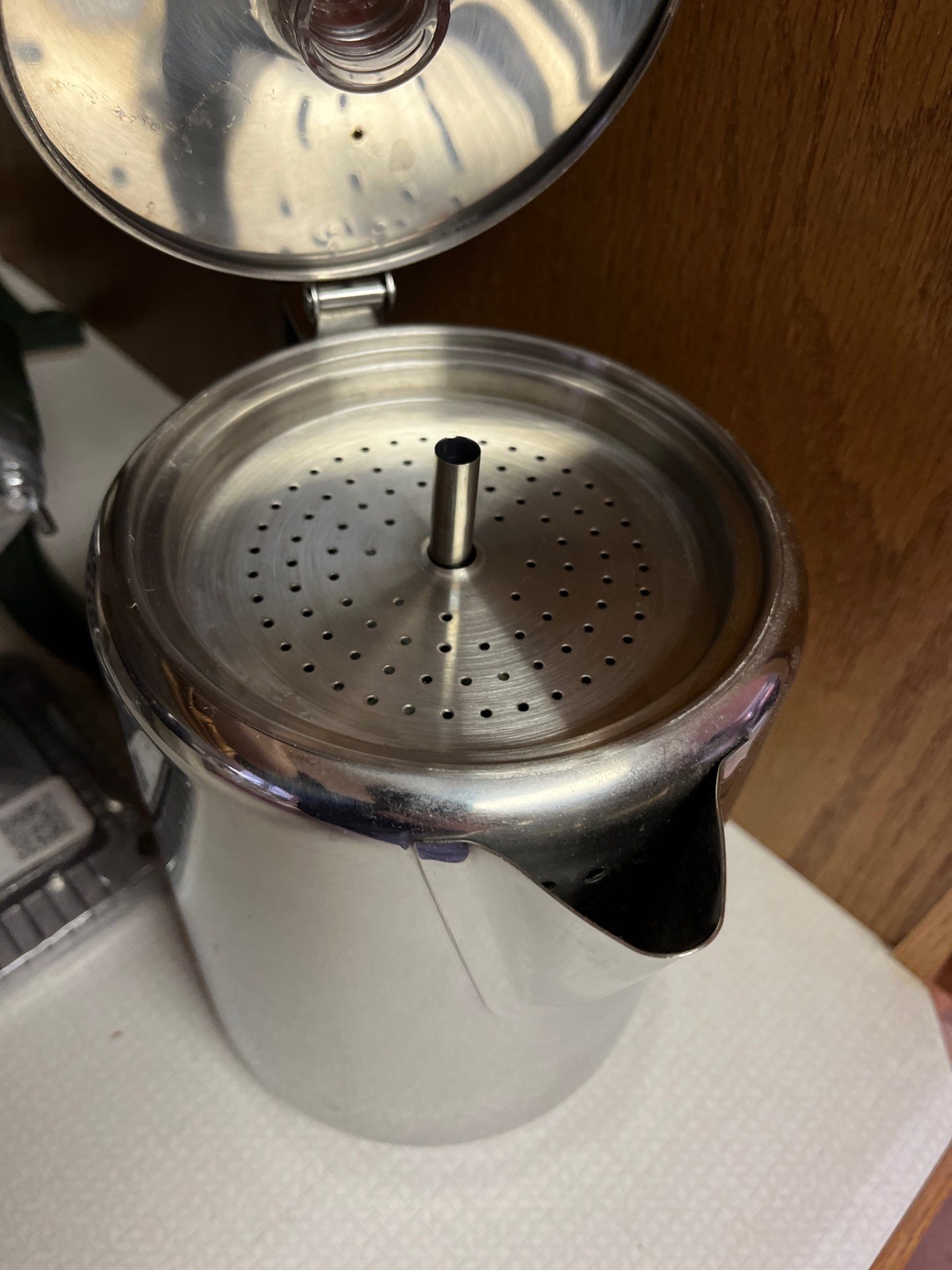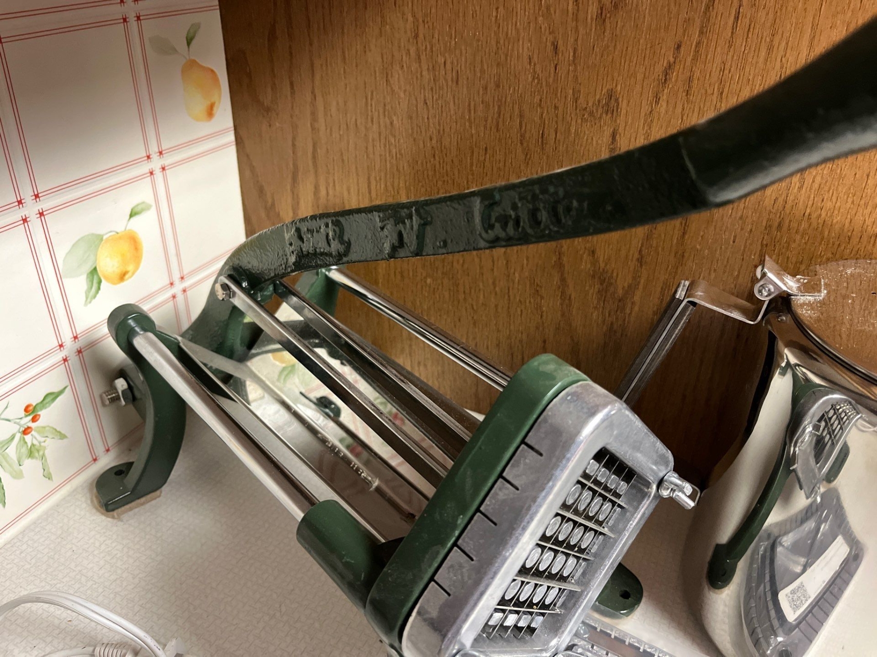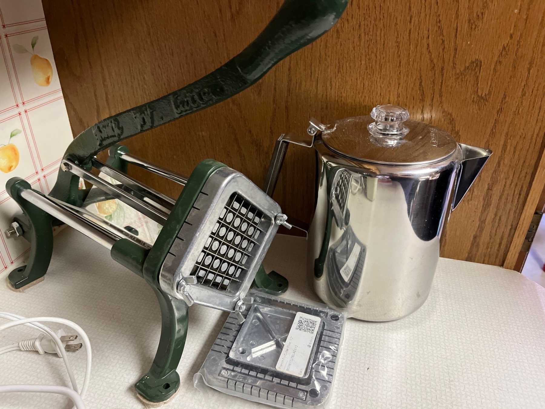 Vintage cast-iron French fry cutter with attachments and a vintage percolator coffee pot