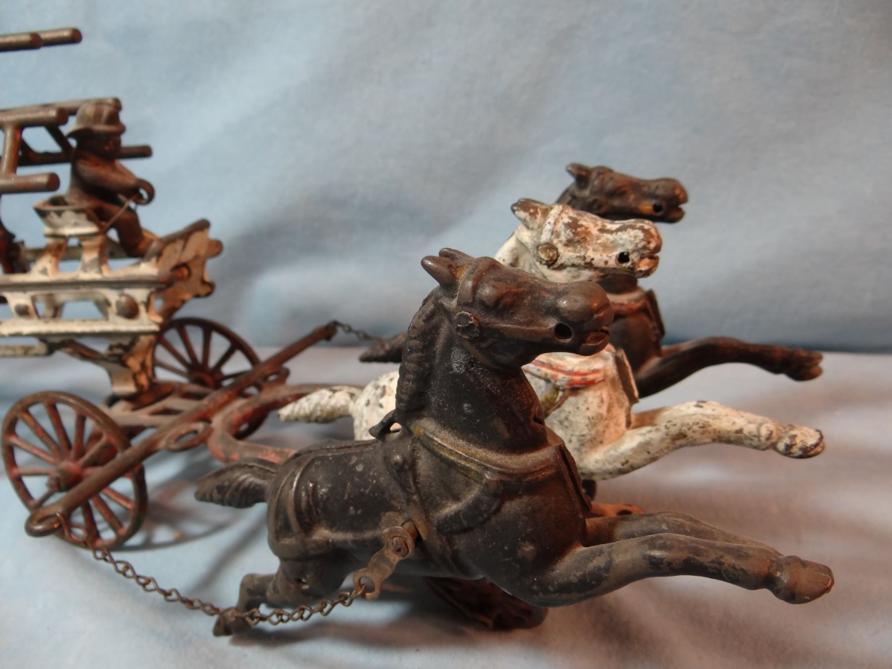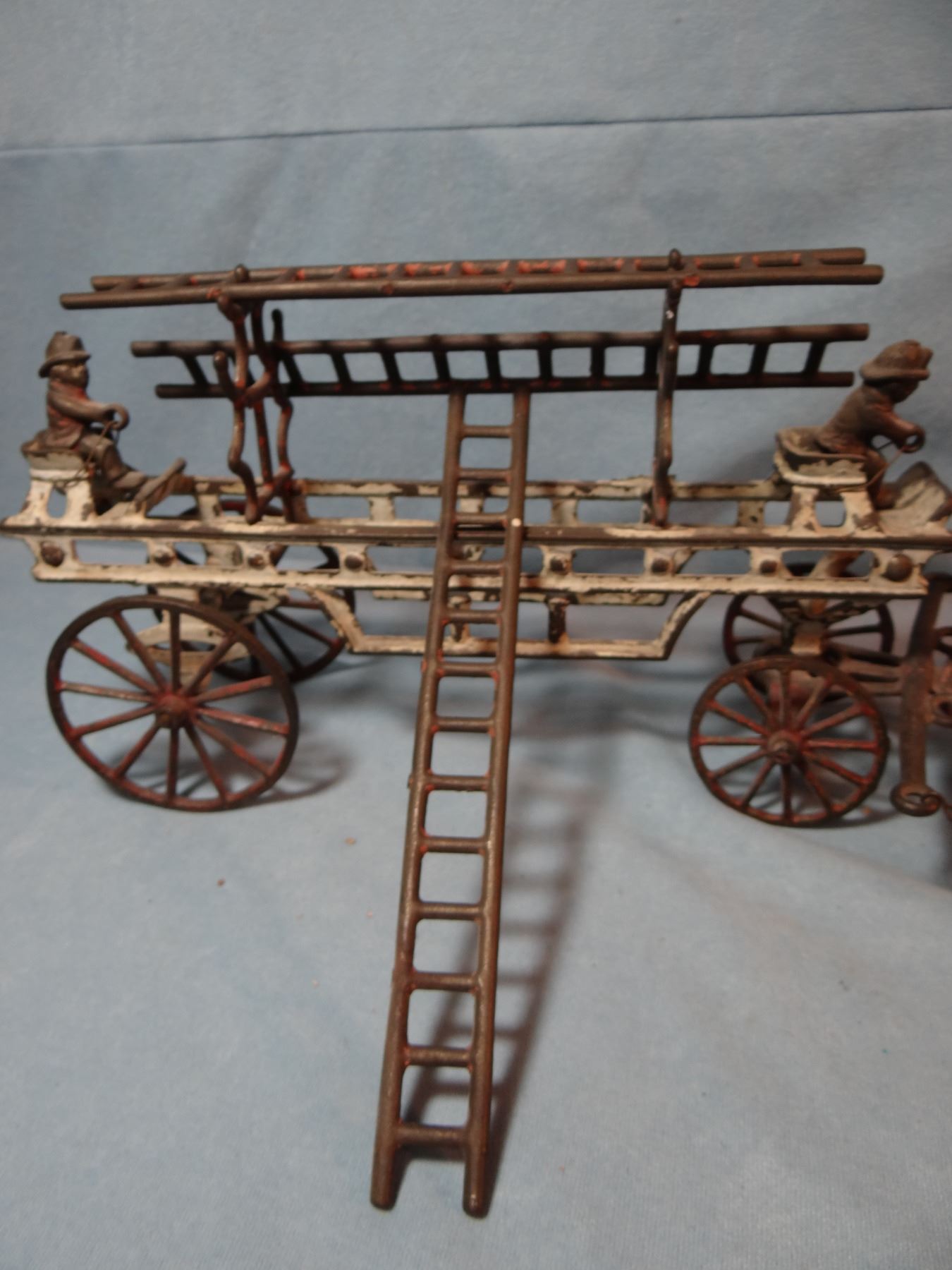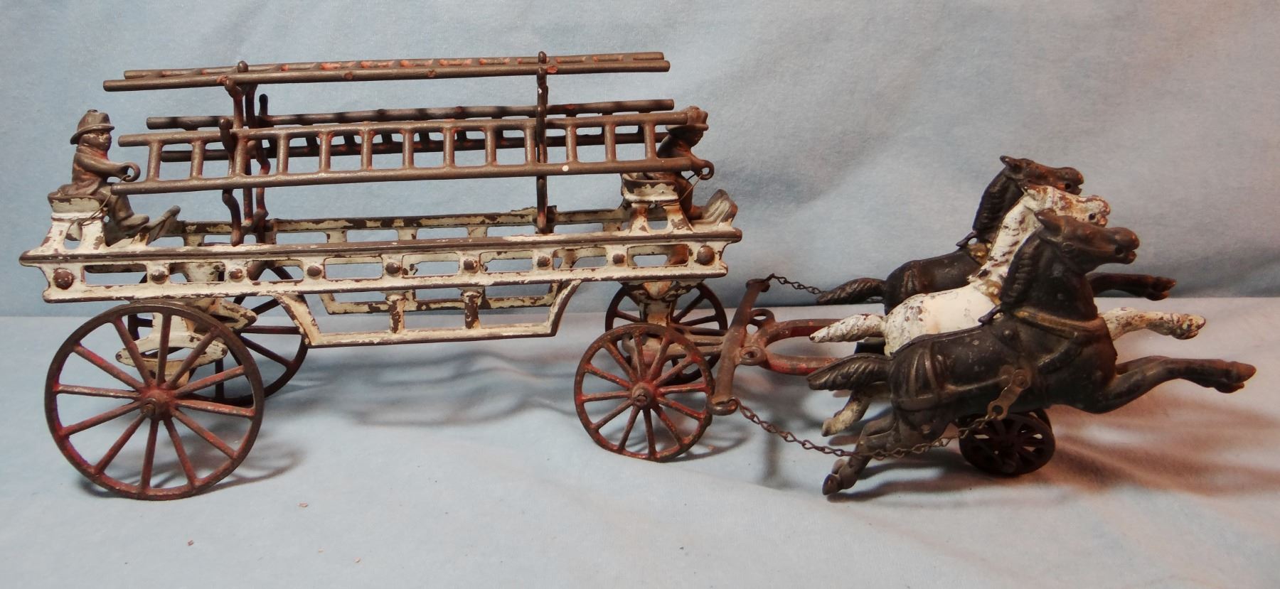Vintage cast iron fire engine ladder wagon w/3 horses & driver, 8" h x 20" l