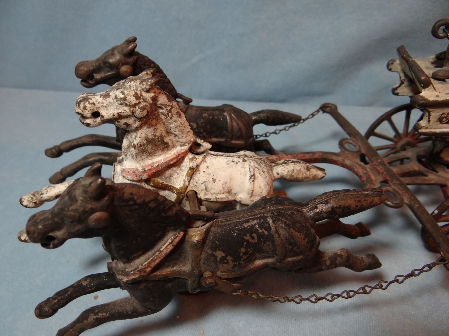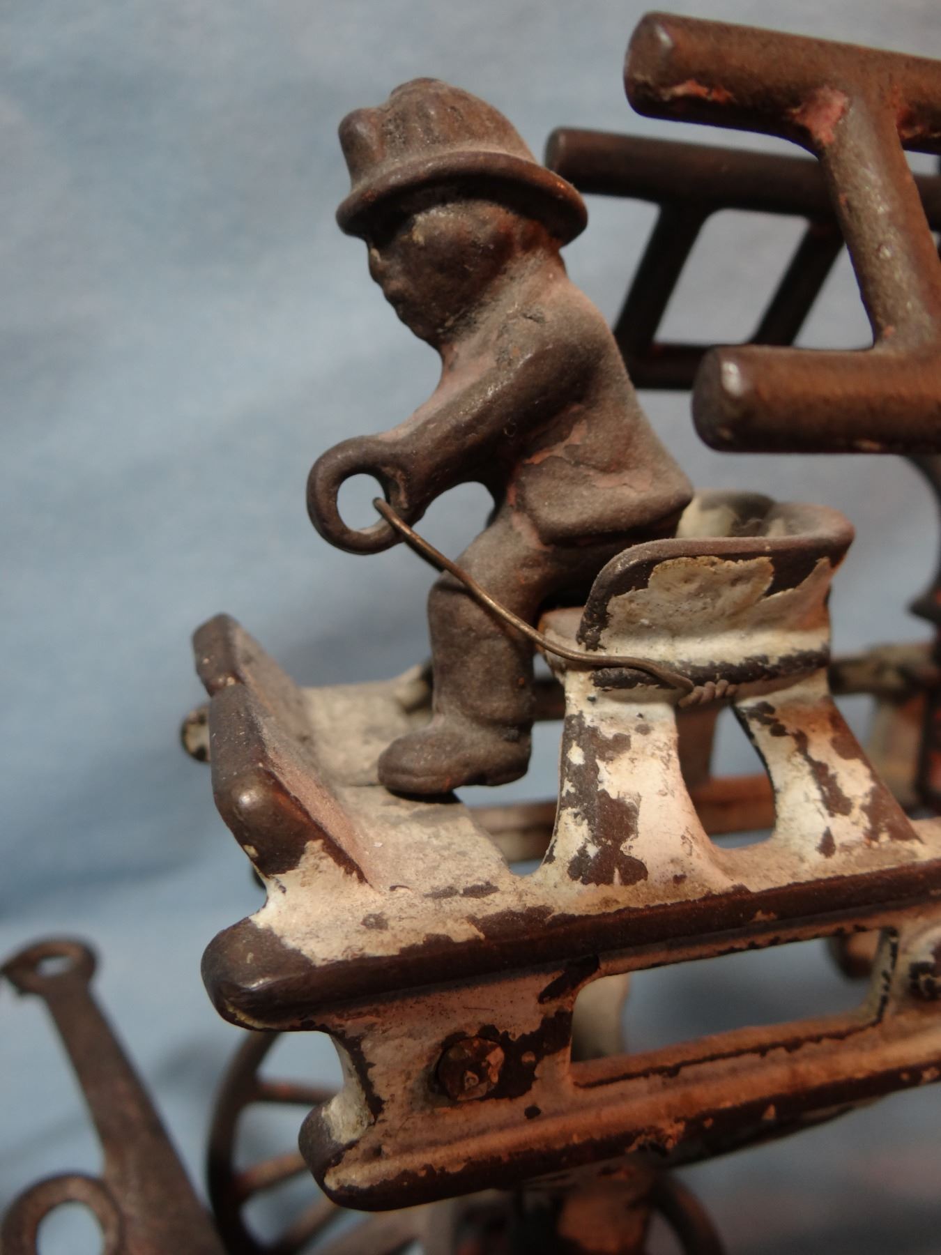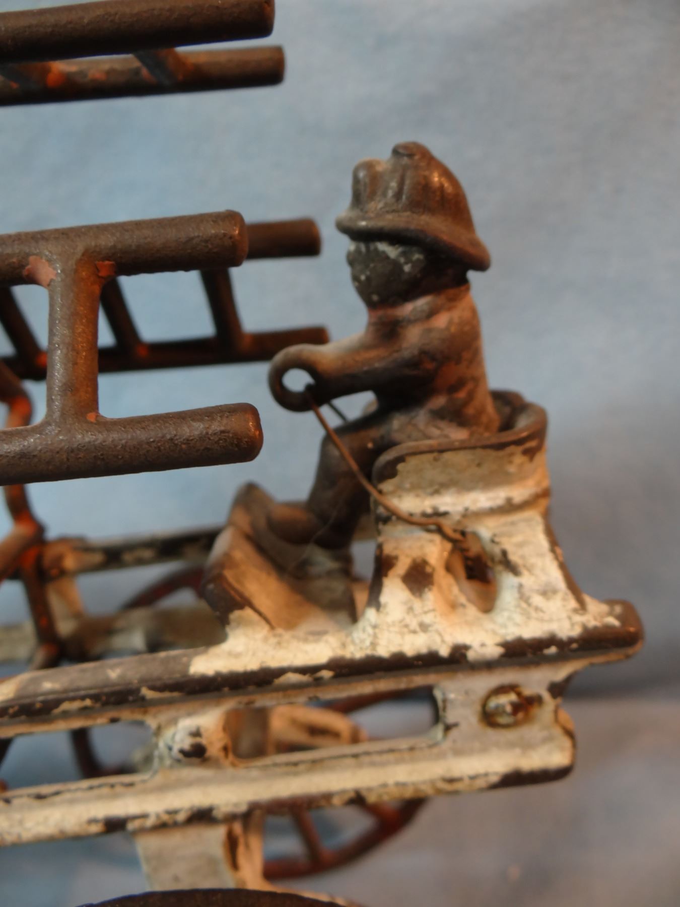 Vintage cast iron fire engine ladder wagon w/3 horses & driver, 8" h x 20" l