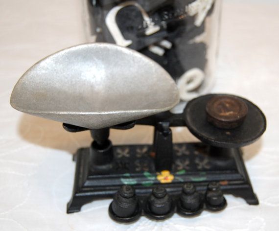 The scale is black cast iron with a cute painted yellow flower and green leaves on the front. The base is 5" by 2 1/4"; it is 3 1/2" tall, including measure bowl. The set includes 4 weights for balancing. This piece was most likely used in a general / candy type store