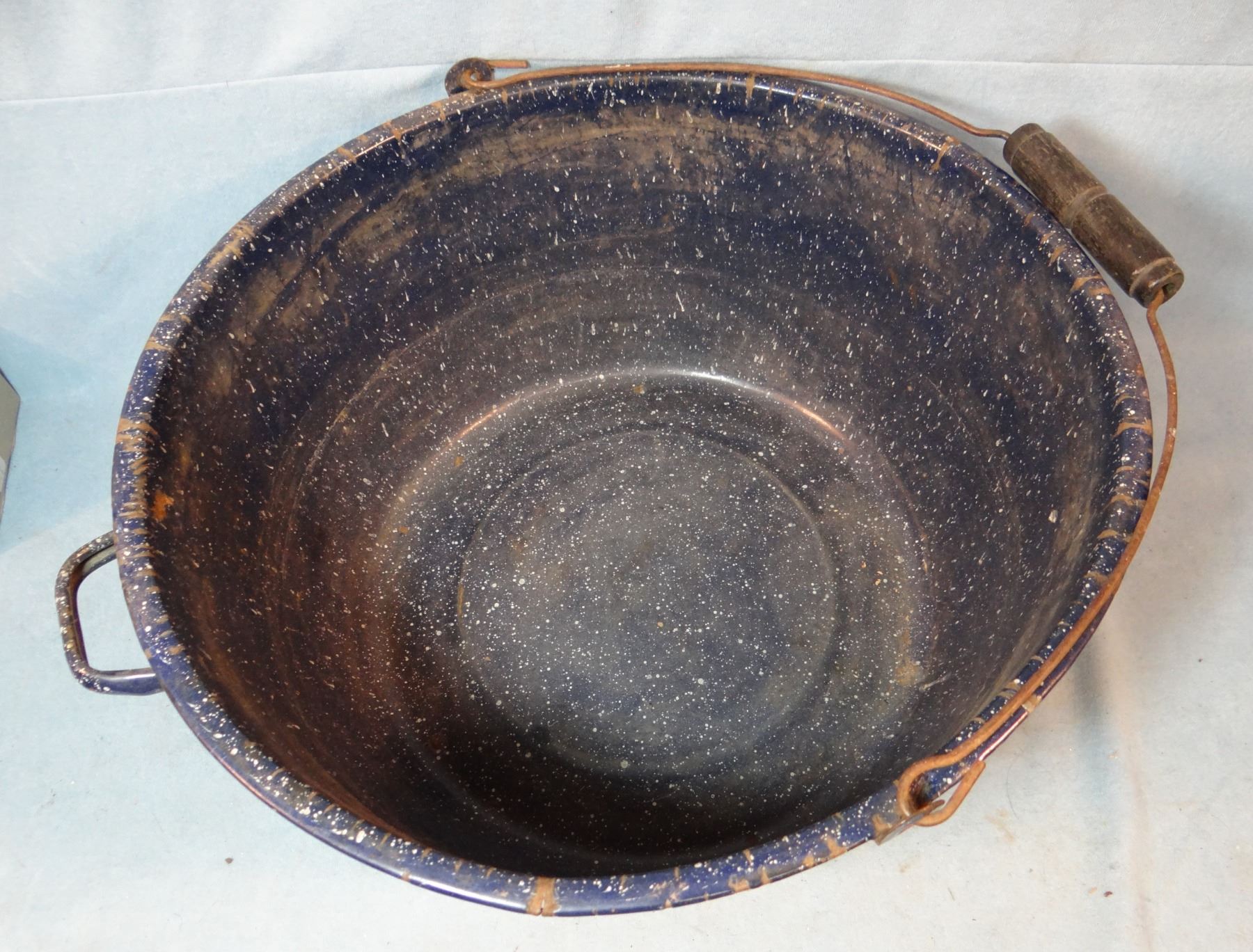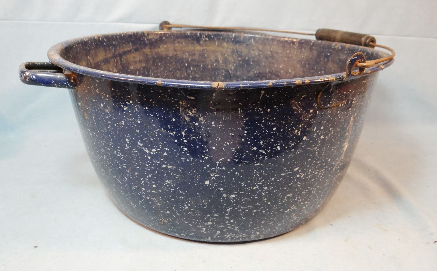 Vintage chuck wagon soup kettle, blue enamel w/ side handles and carry handle, 15" diameter, 7 1/2" tall