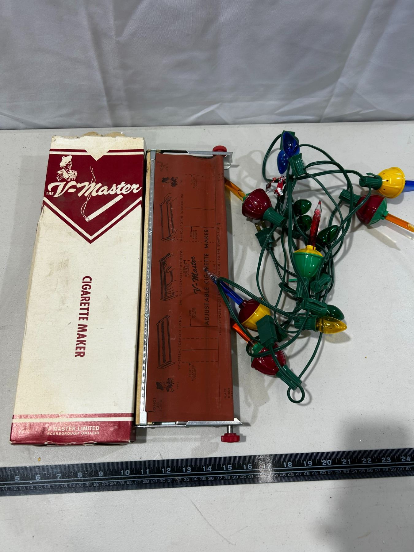 Vintage cigarette maker and string of Christmas lights