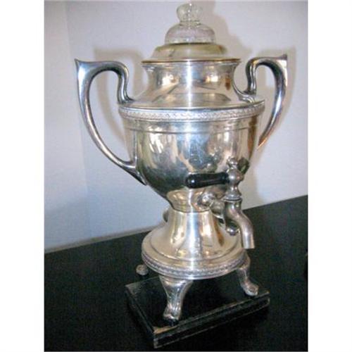 this vintage silver plated detailed samovar/coffee maker with glass and silver top (lid) is very decorative. i have been using it for decorative purposes. actually i have been decorating spaces and using it as a flower vase. the cord is unavailable or any other attachment if any. this samovar has lots of carving with great detail. beautiful workmanship and very nice accessory. it is in good condition with normal wear and tear. imperfection i.e. scratches invisible. there are stamps on the bottom and on top of spout black glass handle. please review all the images. measures 12 inches tall and almost 7 inches wide with about 4.5 inches depth.