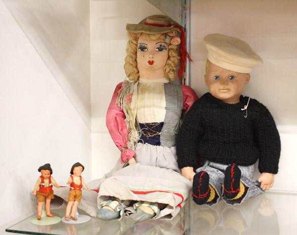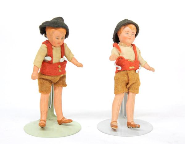 (lot of 4) Vintage dolls including a circa 1930 cloth boudoir doll, 21.5''l; mid-century boy doll havng a molded compostion dome on a vinyl body, 15.5''l; and two German miniature hand-painted bisque dolls with articulated limbs, 3''
