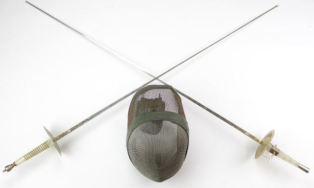 with 2 swords and mask, marked Spain on ricasso. Est. 75-150