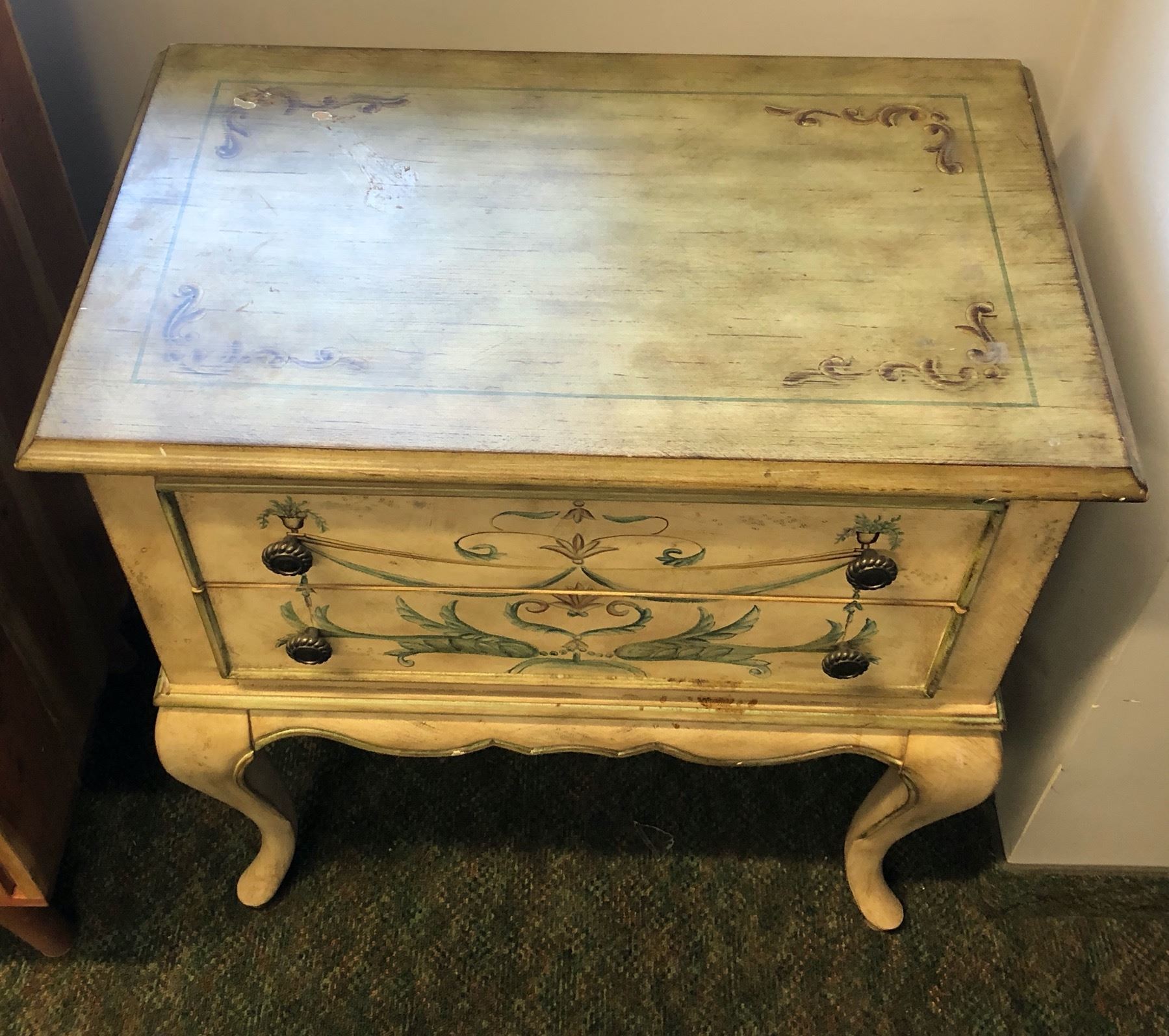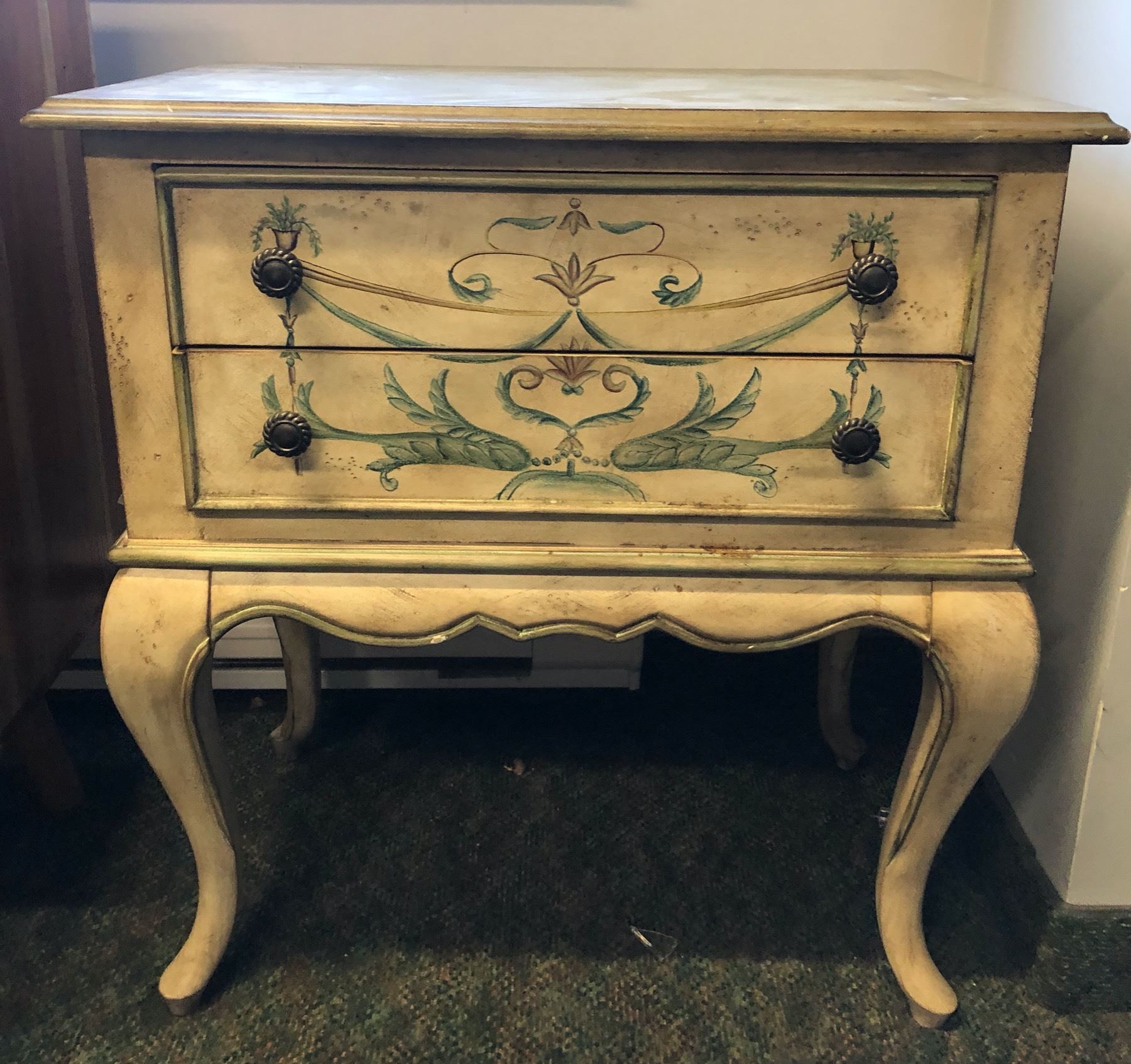 Vintage floral 2 drawer end-table (approx. 26in wide x 16in depth x 28in height)