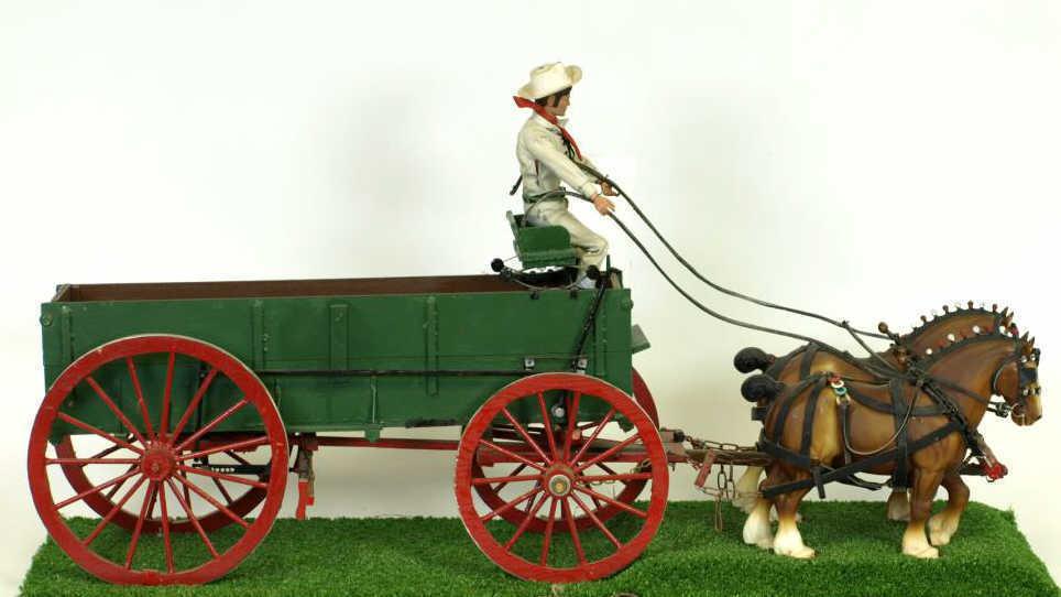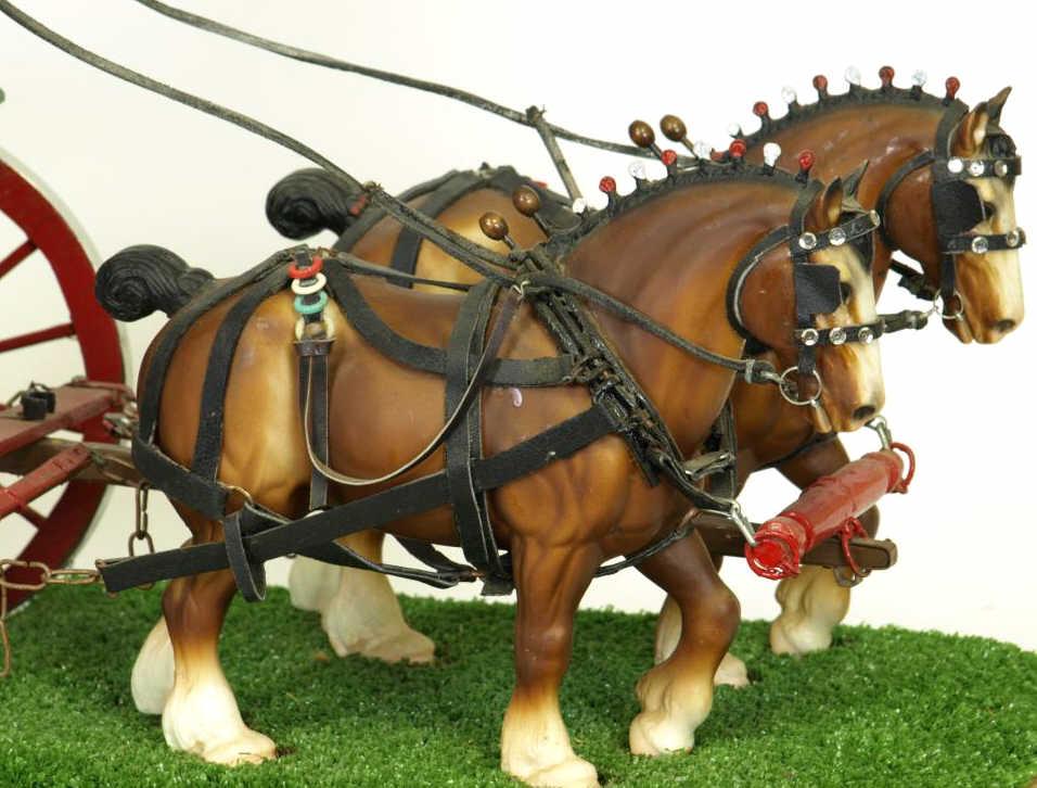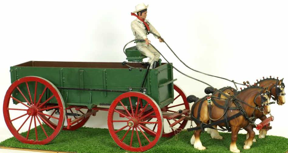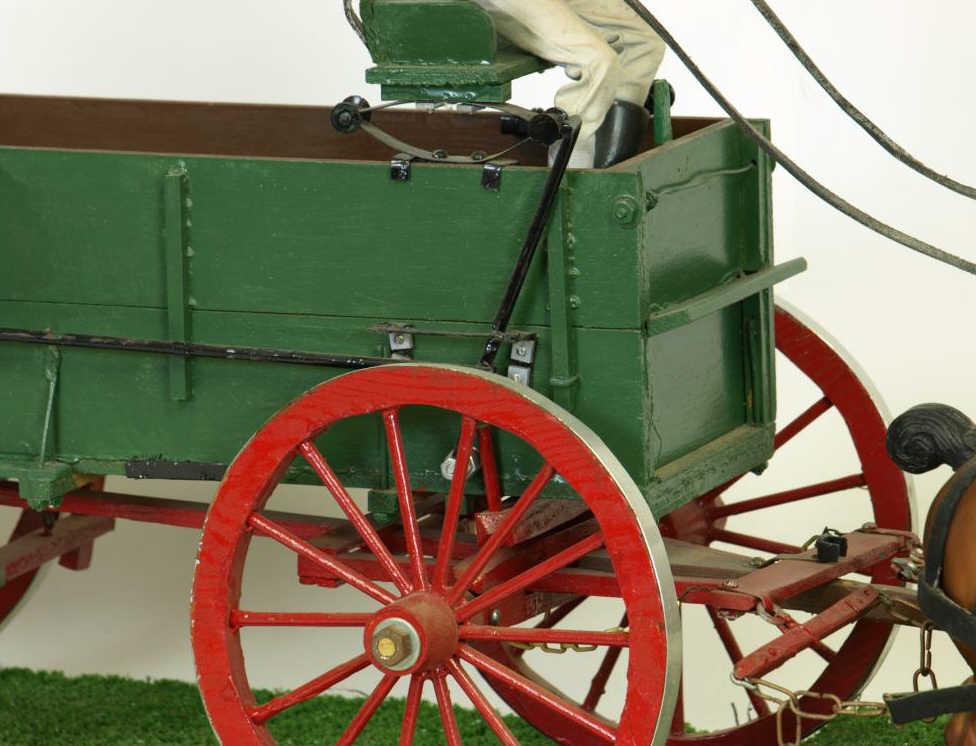 of horses. Great detail including operating brakes, spring seat, harnesses and includes the driver. Measures 35" long X 18" tall.