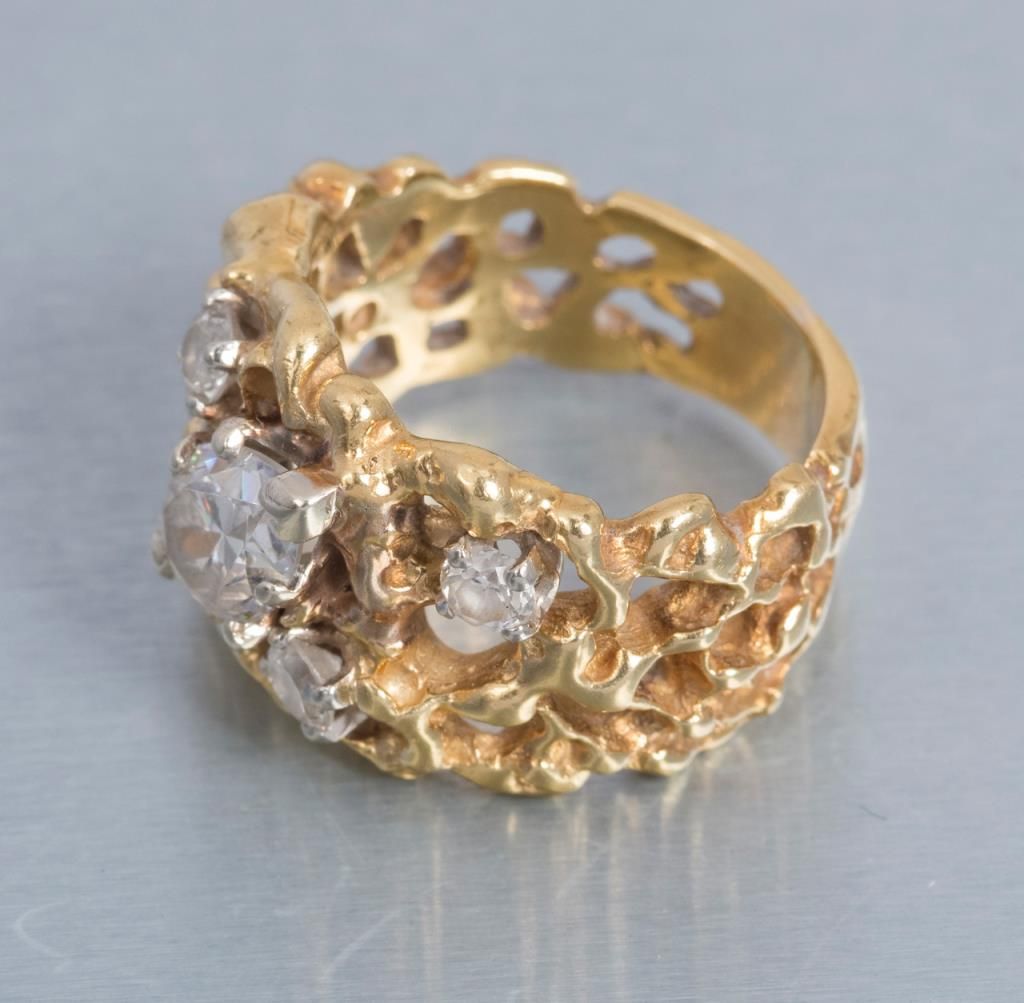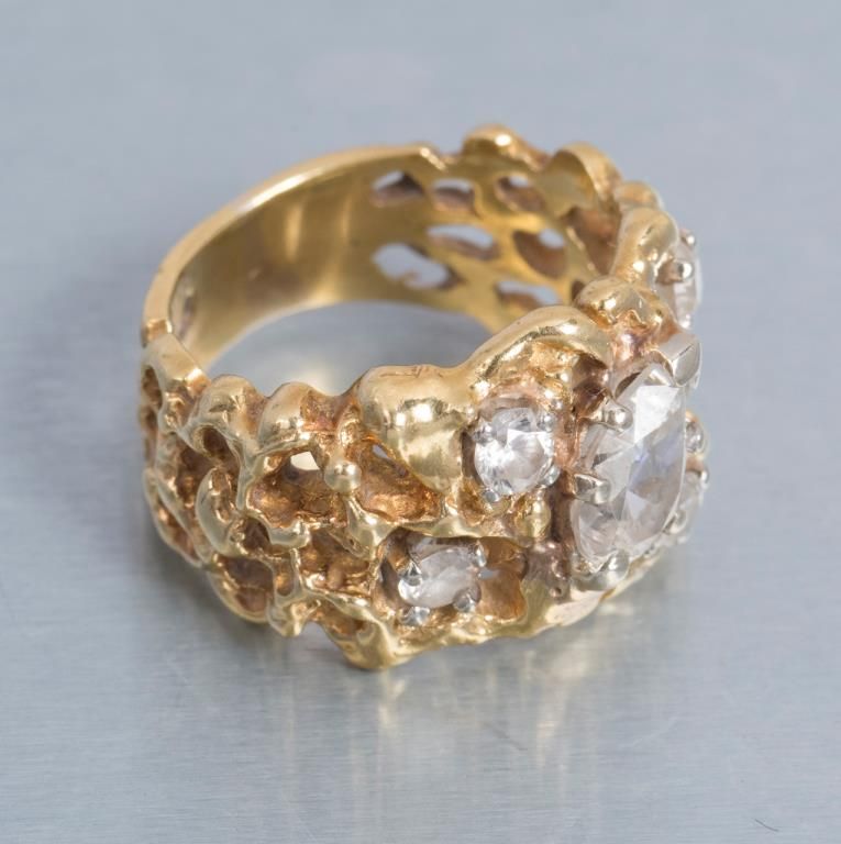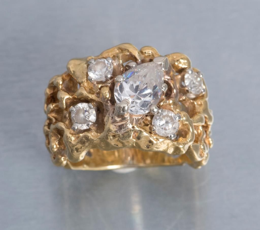 Vintage ladies ring in 14K wrought gold mounted with over 1/2ct pear shaped cubic zirconia and surrounding round cubic zirconia; good quality; gold not marked but tests 14K or better. Est.: $250-$500