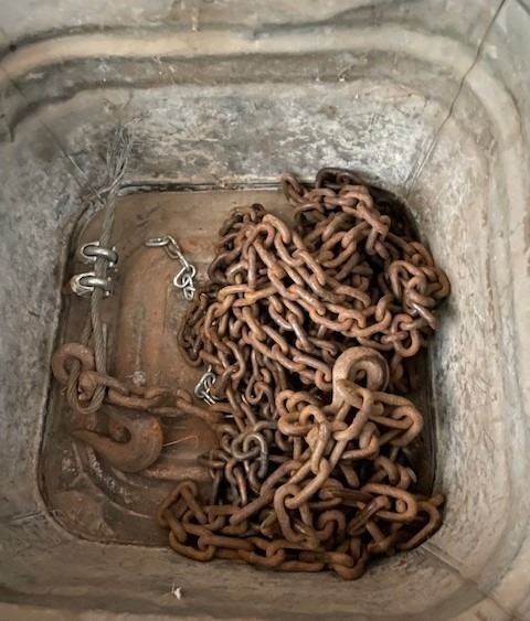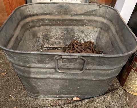 Vintage large metal tub containing 3 heavy duty chains with hooks: 1' chain with 2 hooks, 15' chain with 1 hook, 32' chain with 2 hooks