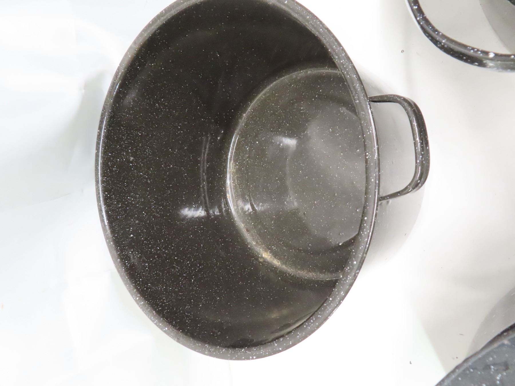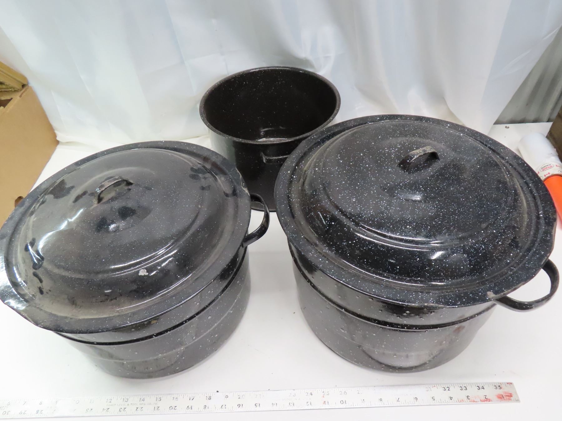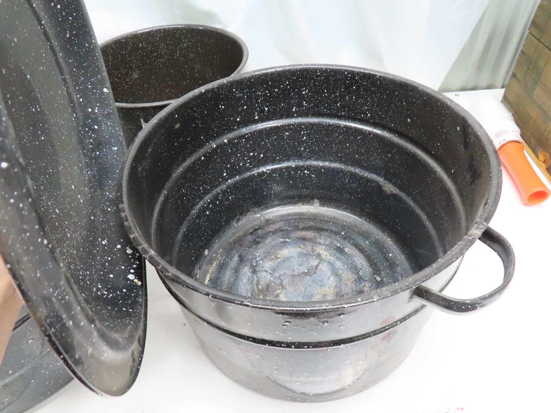 Vintage large round black enamel canning pots