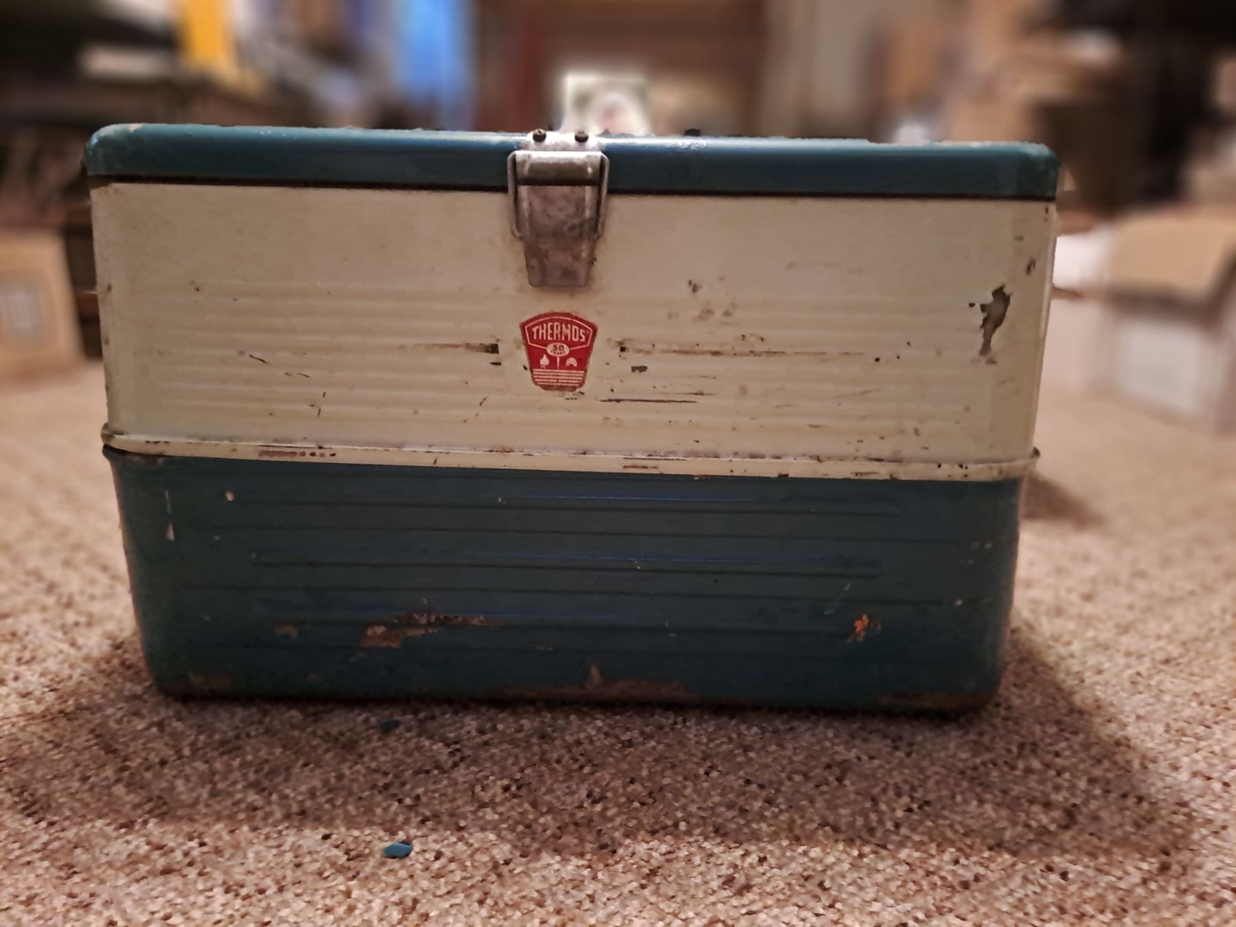 Vintage metal Thermos ice chest cooler, with tray and all latches and hinges in place