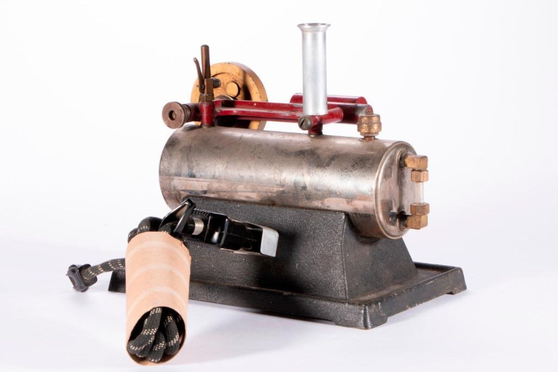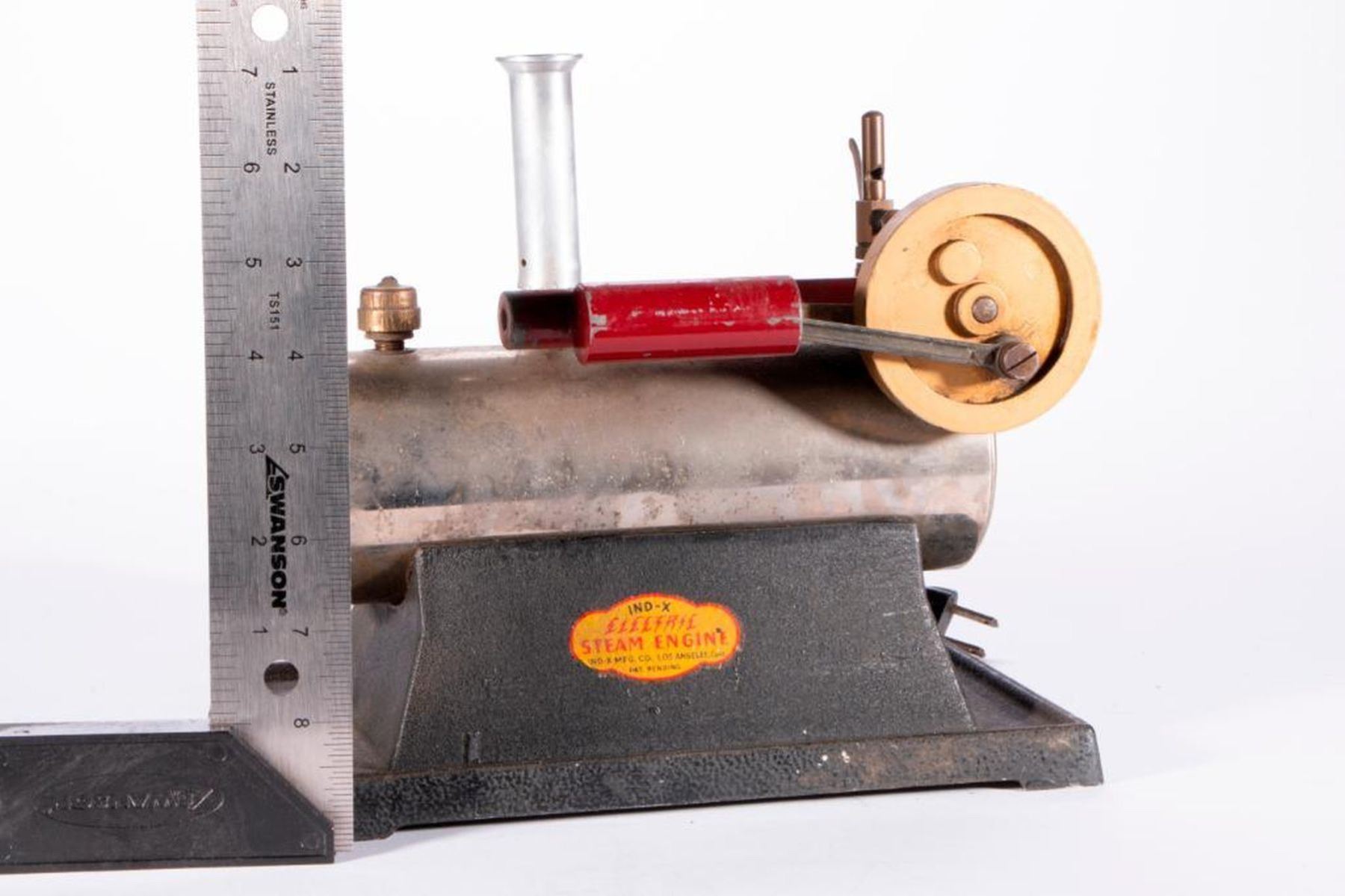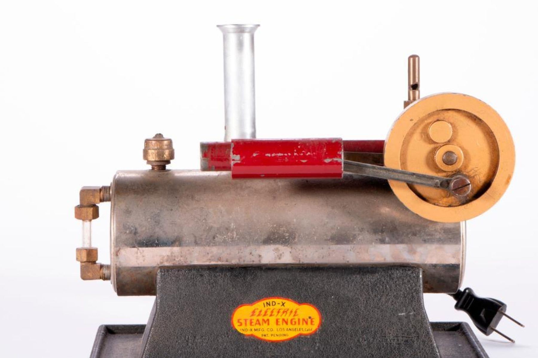 A vintage model steam engine marked IND-X Electric Steam Engine. Los Angeles, Calif. Pat Pending. 8 high x 10 x 7. As shown. Items are sold as is. Please inquire about condition if not otherwise stated.